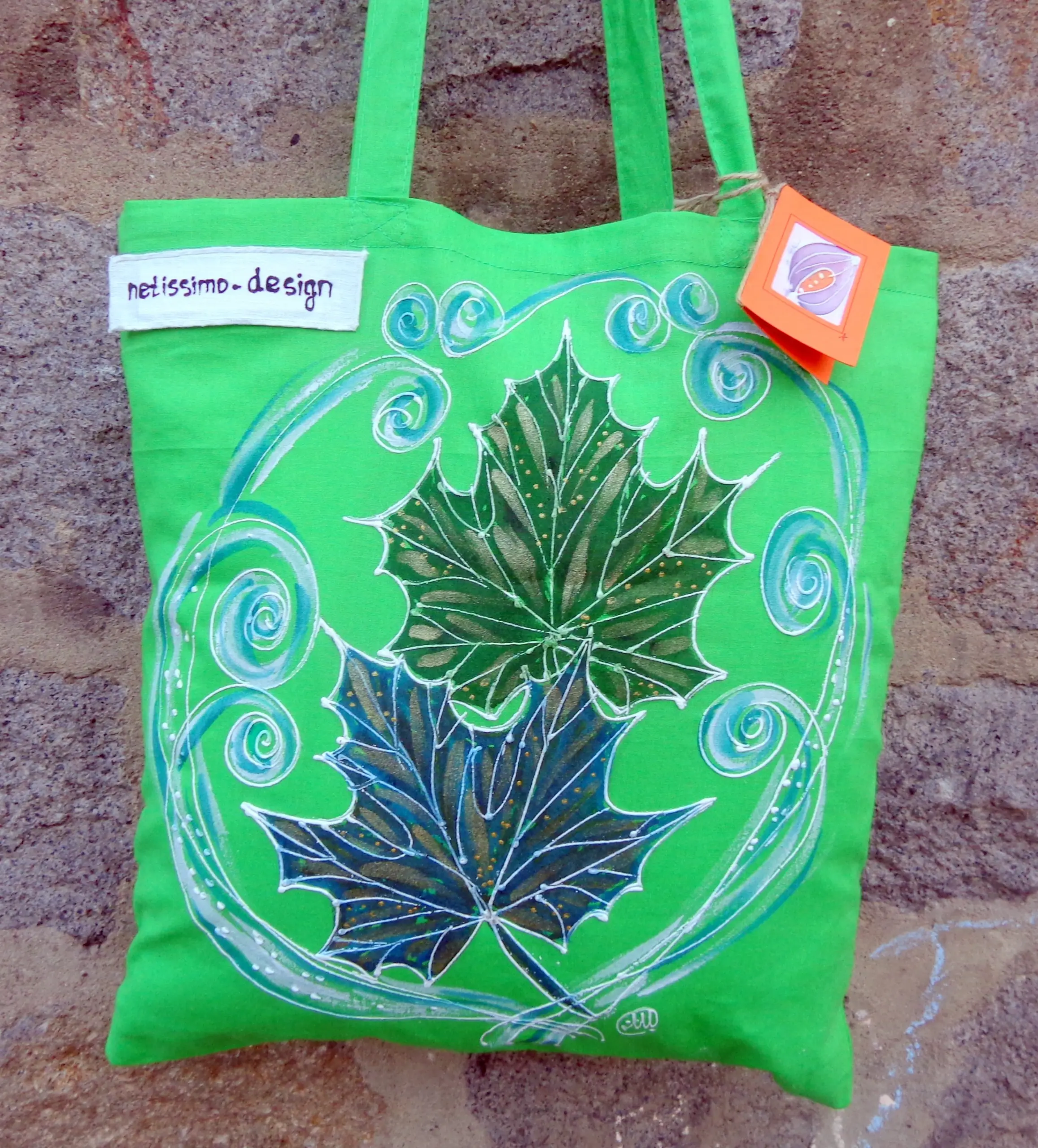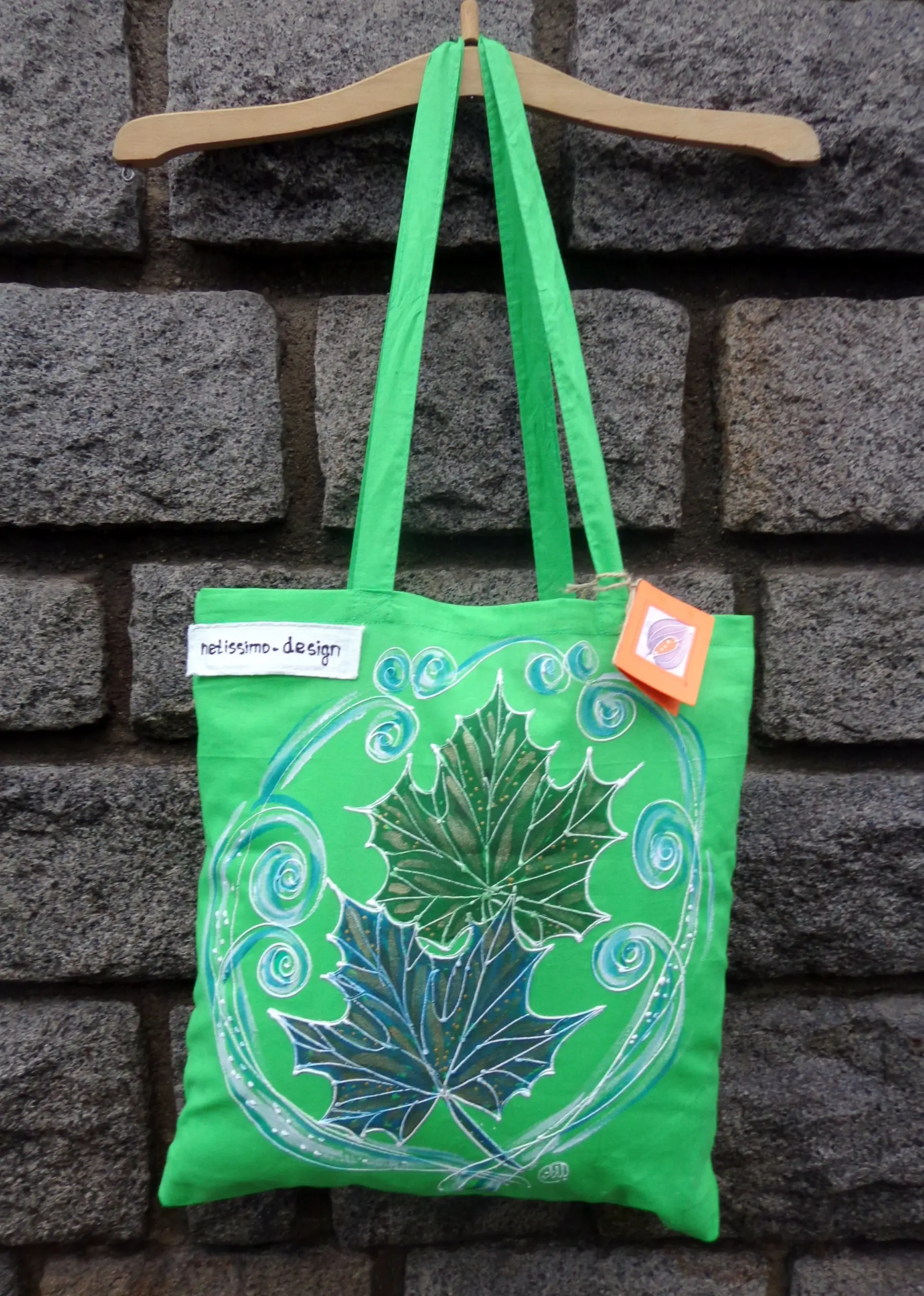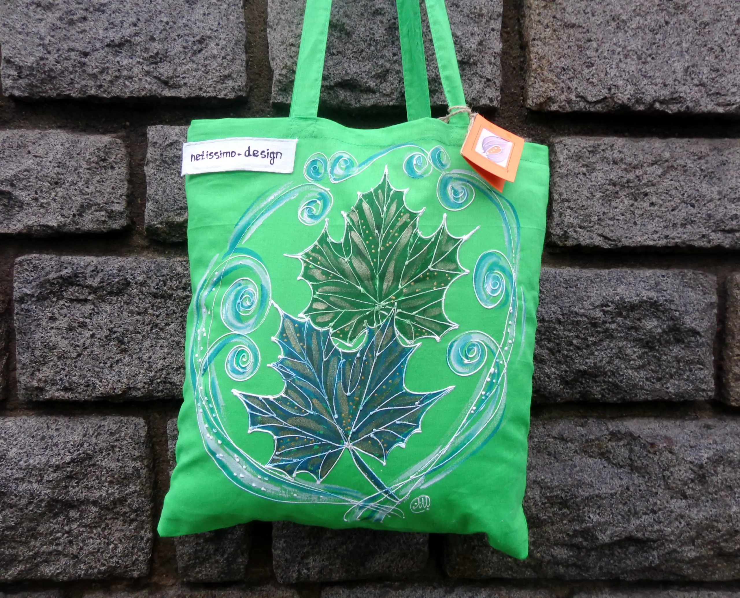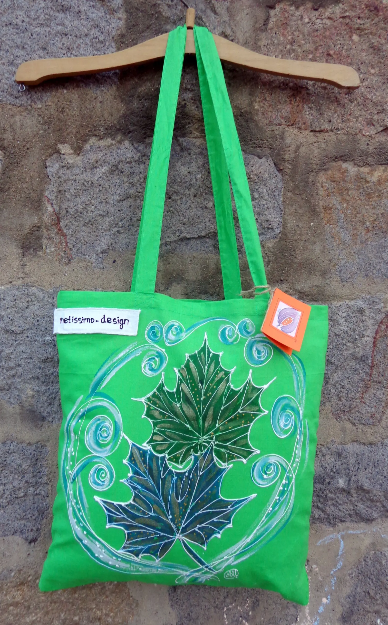Всеки чанта е уникат, рисуван на ръка върху 100 % органичен памук с мотив.