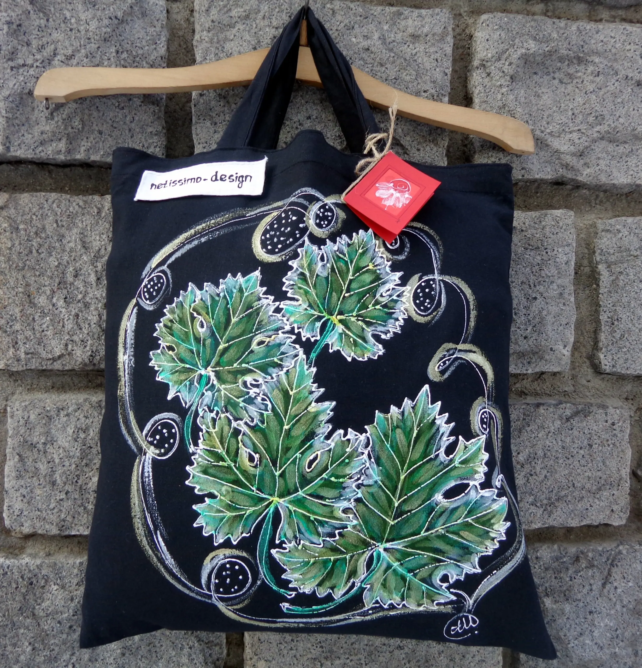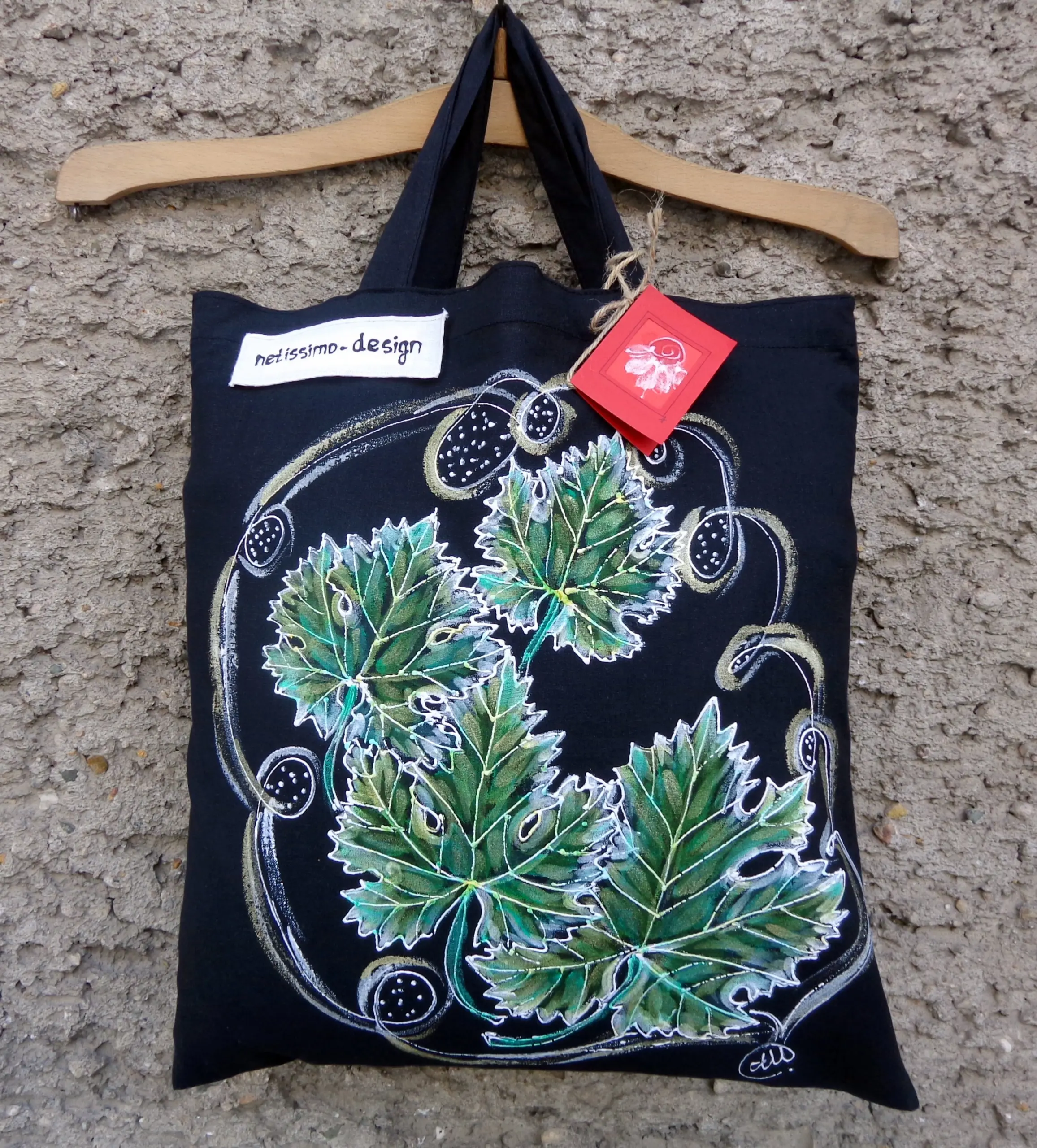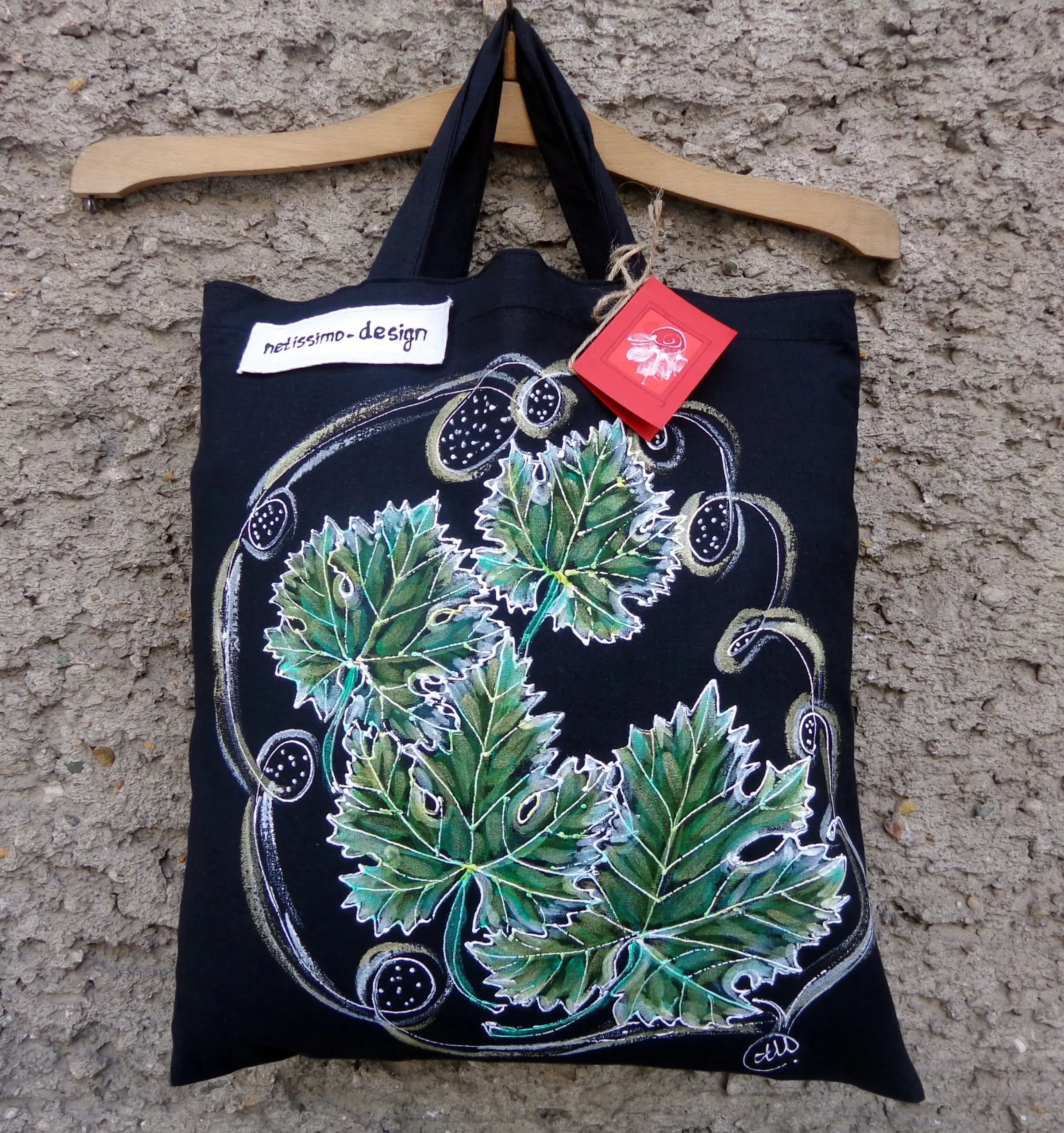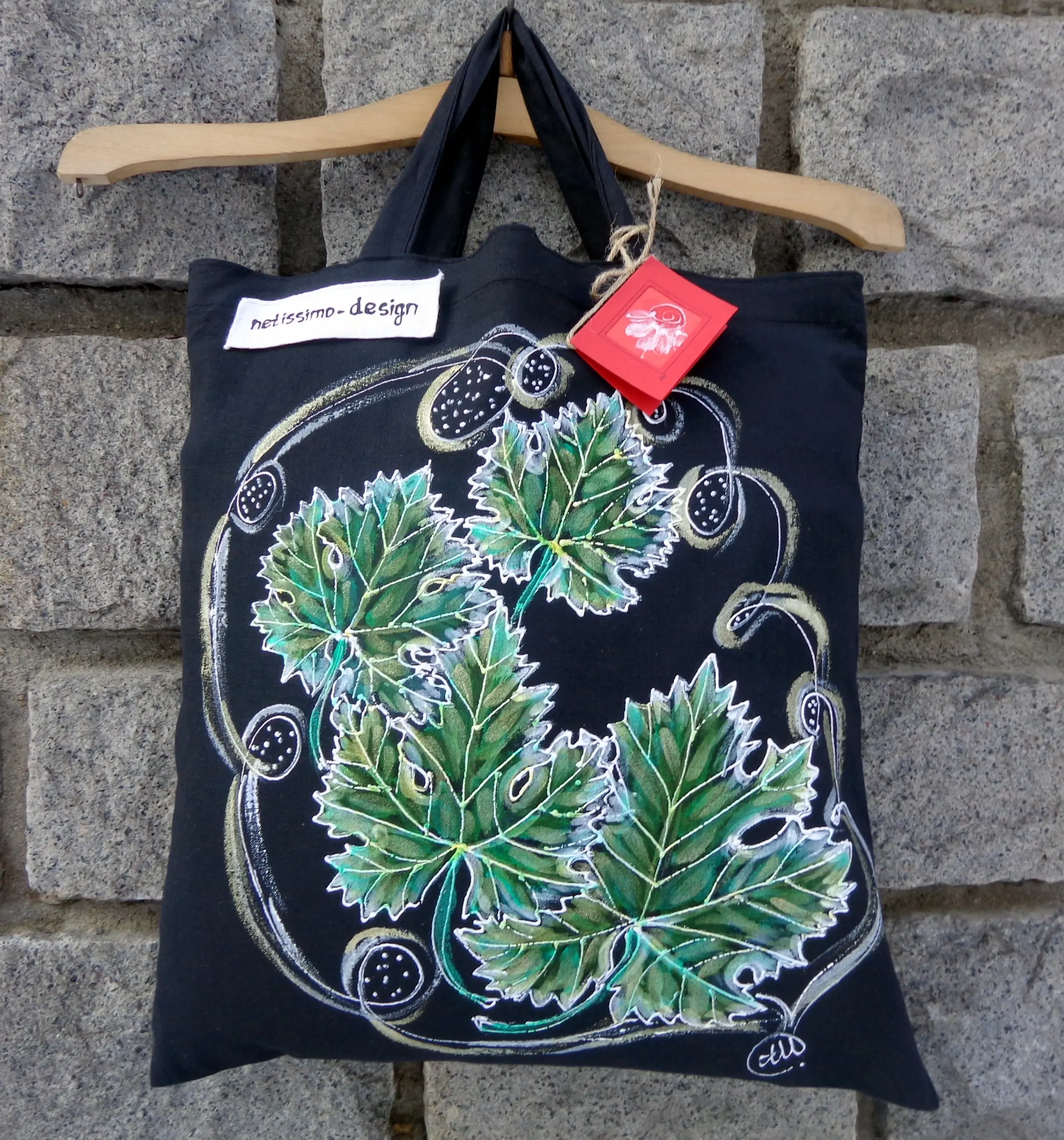 Всеки чанта е уникат, рисуван на ръка върху 100 % органичен памук с мотив.