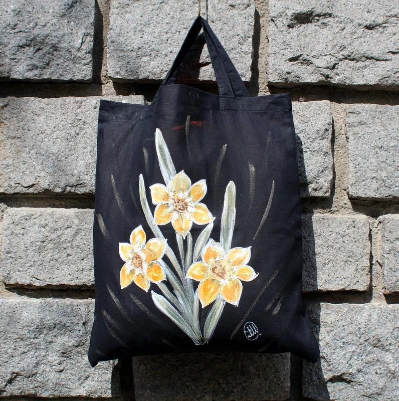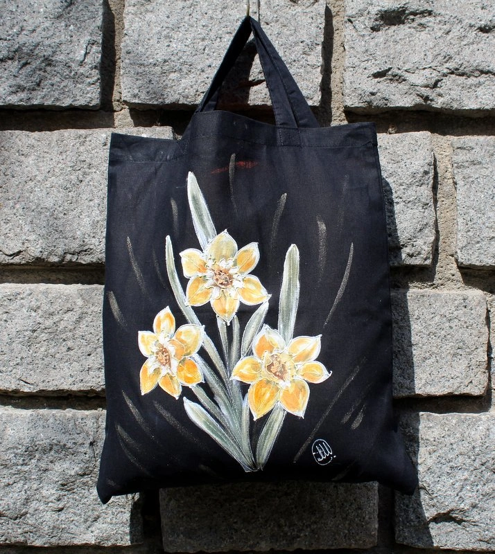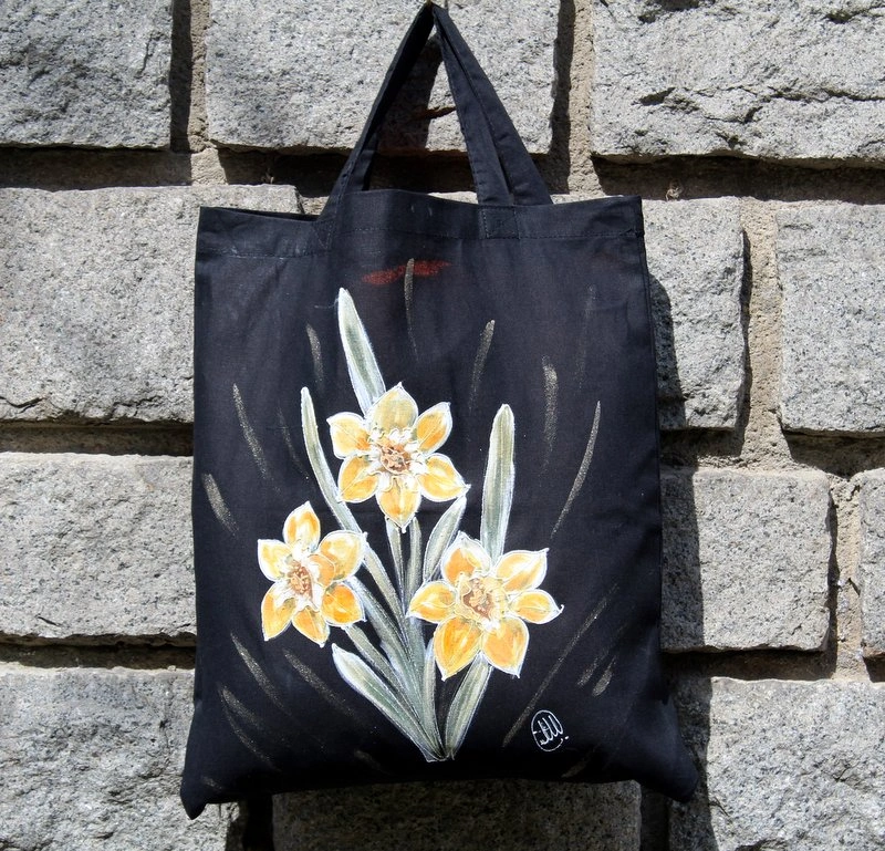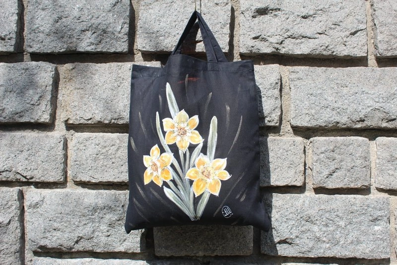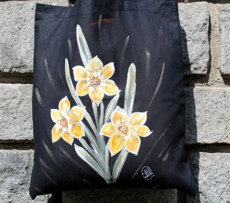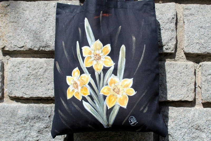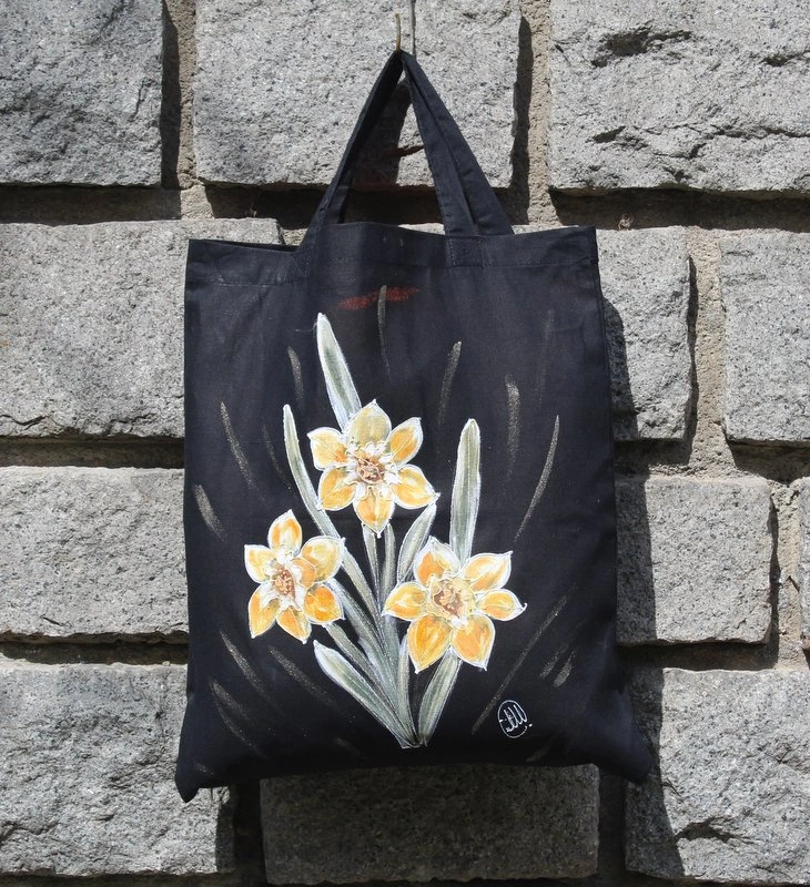 Всяка чанта е уникална,рисувана на ръка върху 100 % органичен памук с мотив. Цветето Нарцис произлиза от мита за красивия младеж,която се влюбва в собственото си отражение и загива,символизирайки опасностите от прекомерната гордост и суета.Нарцисът често се използва като символ на Великден,подчертавайки темата за възкресението и надеждата.