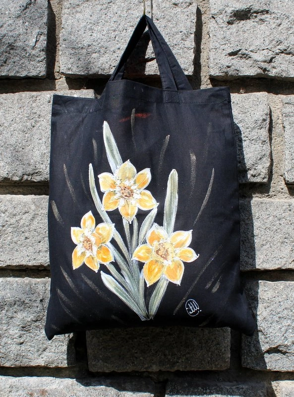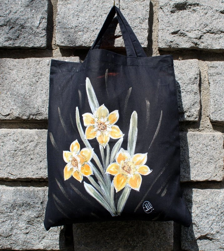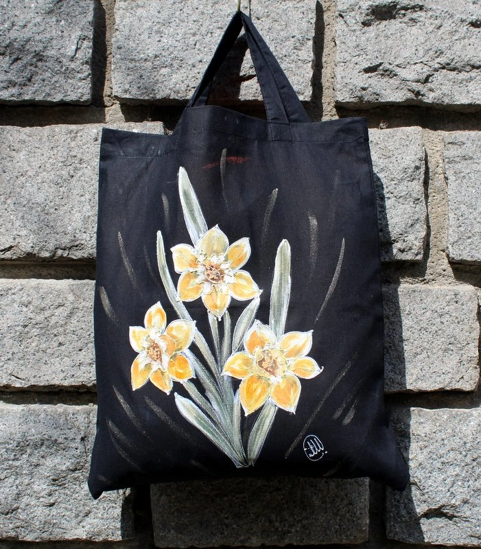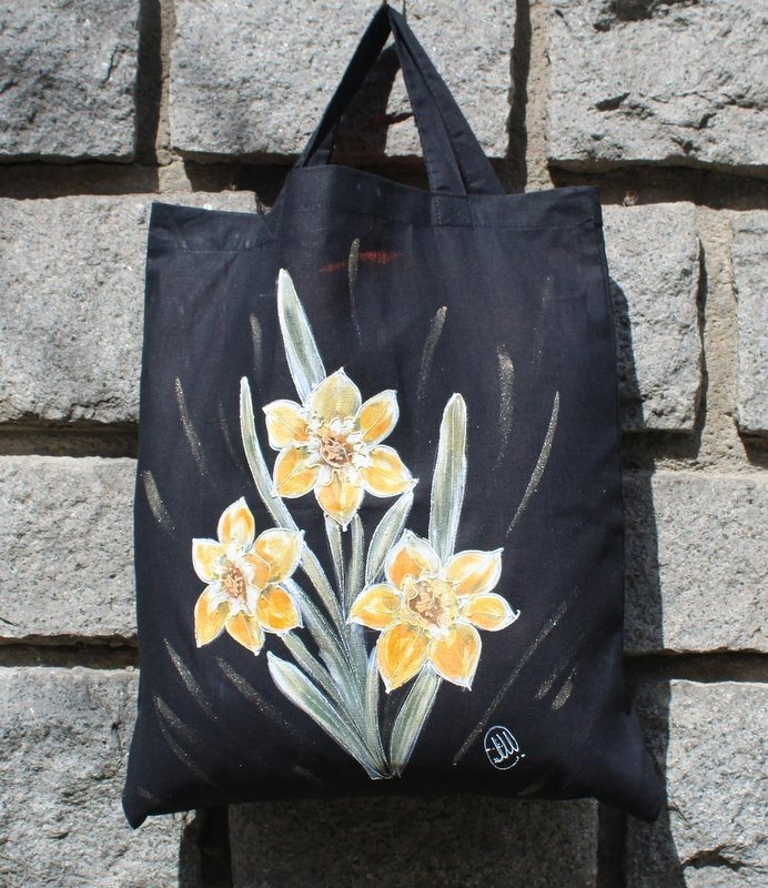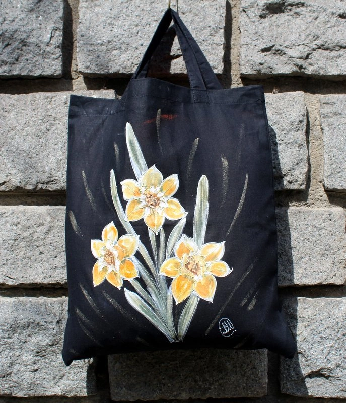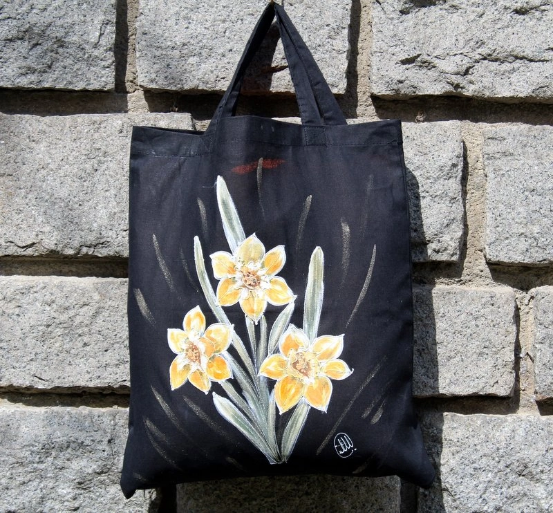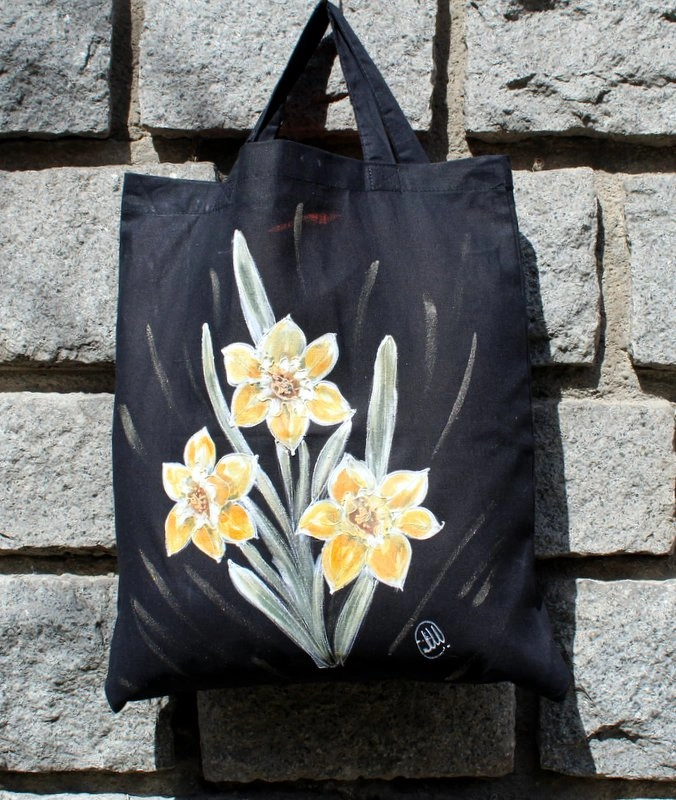 Всяка чанта е уникална,рисувана на ръка върху 100 % органичен памук с мотив. Цветето Нарцис произлиза от мита за красивия младеж,която се влюбва в собственото си отражение и загива,символизирайки опасностите от прекомерната гордост и суета.Нарцисът често се използва като символ на Великден,подчертавайки темата за възкресението и надеждата.