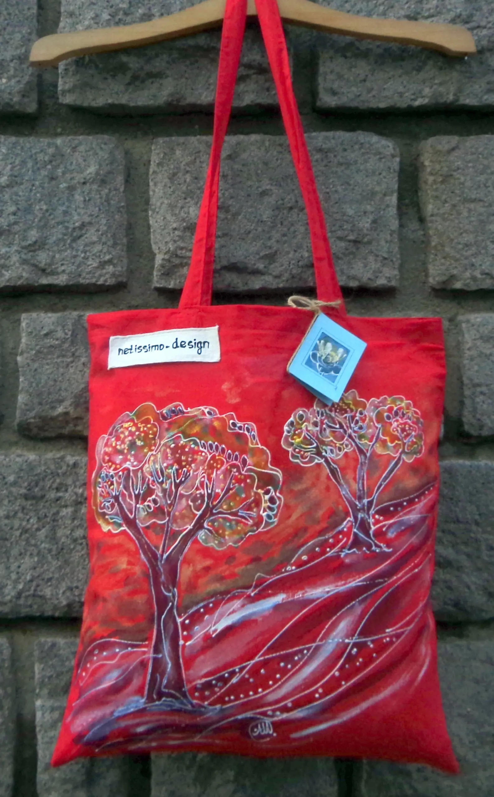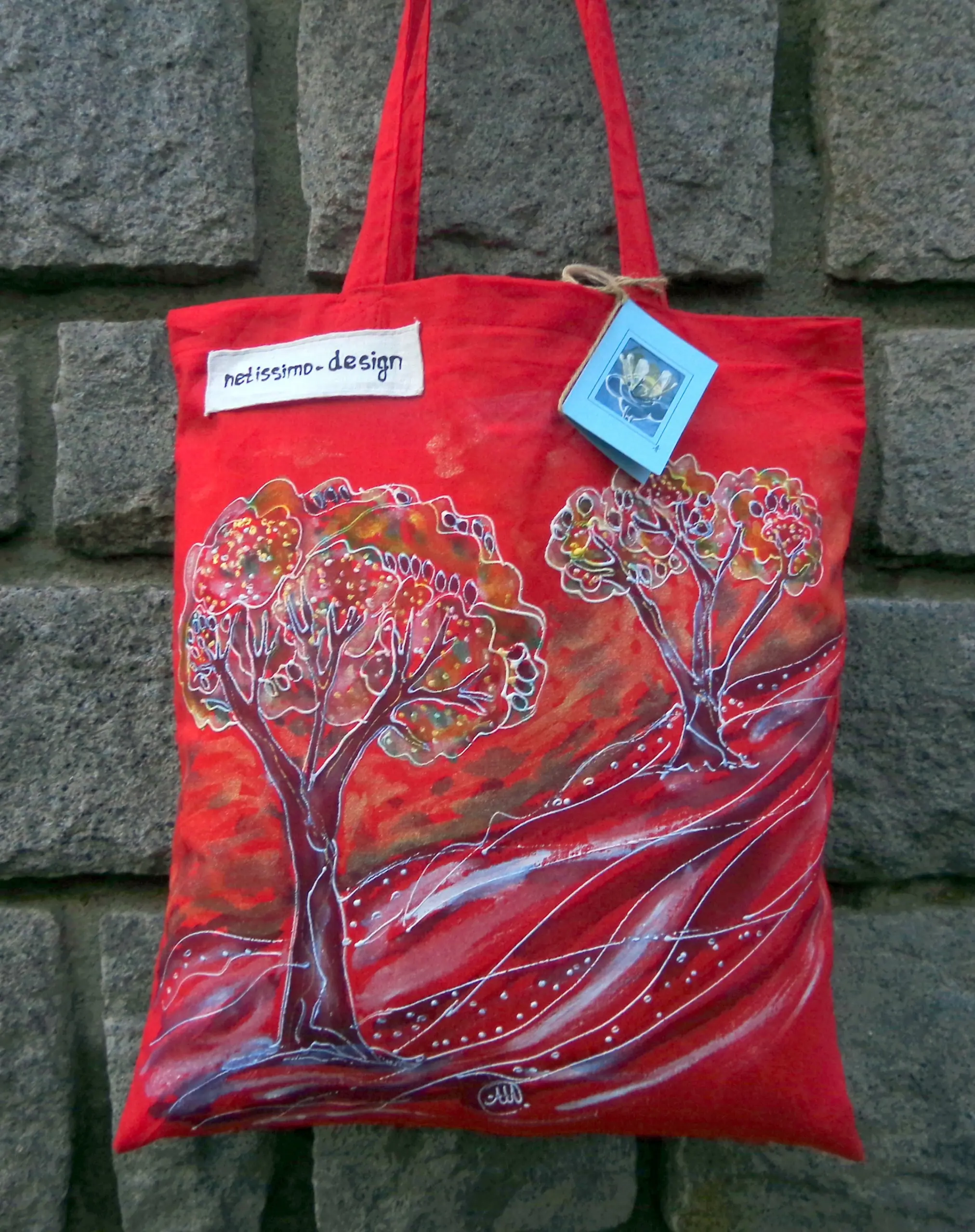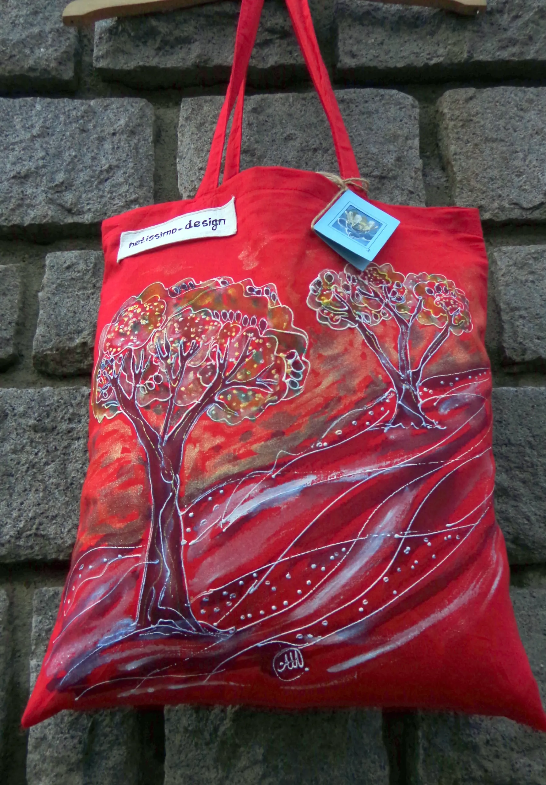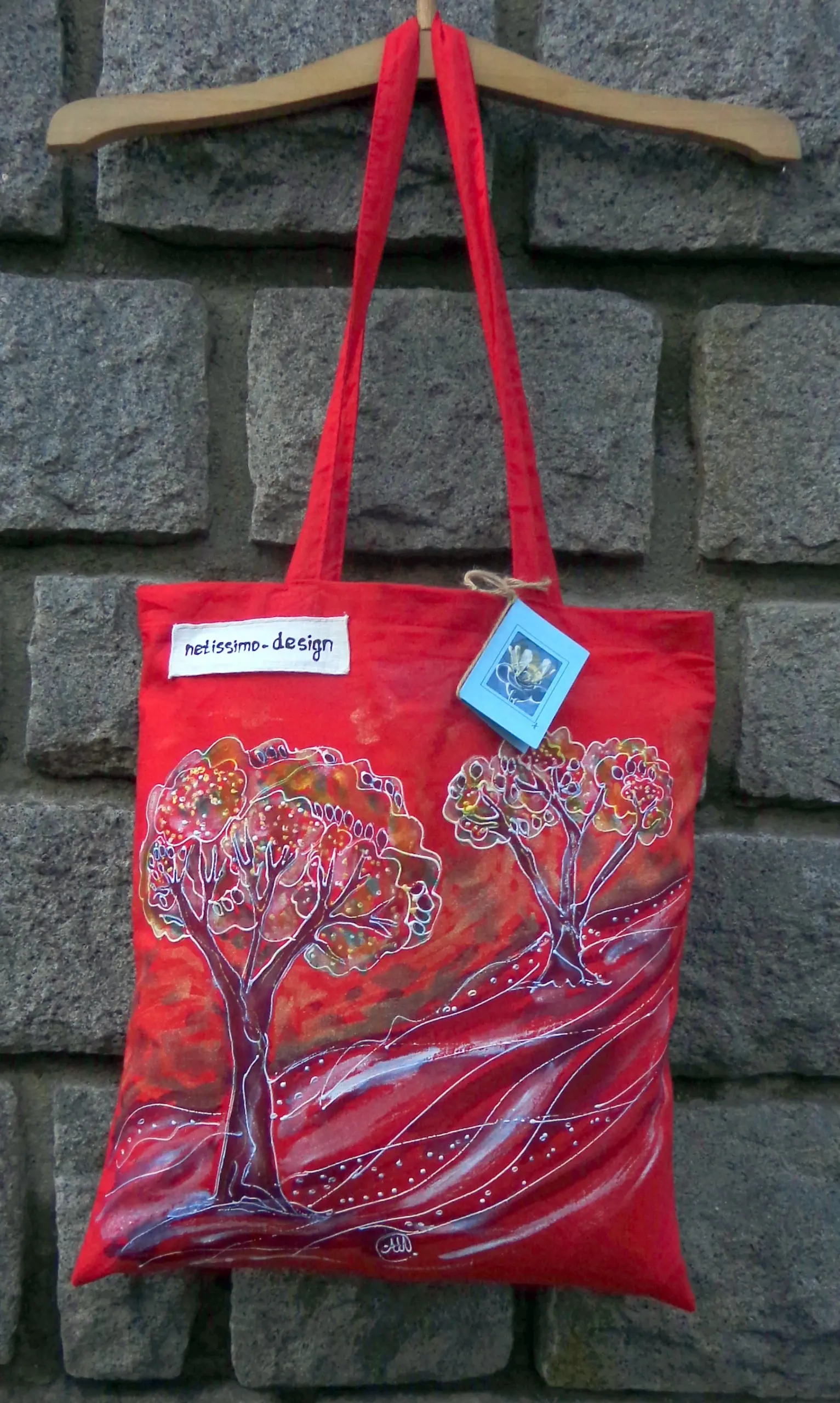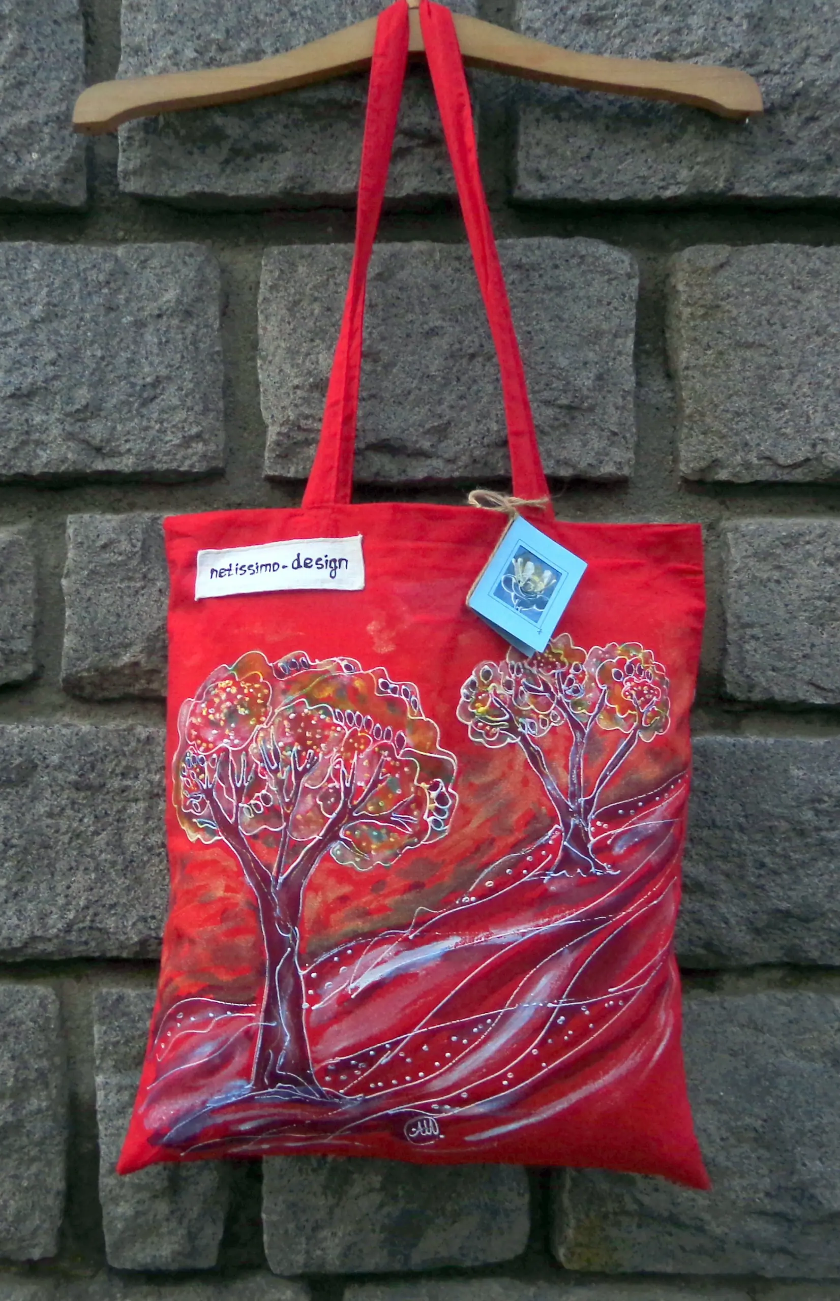 Всеки чанта е уникат, рисуван на ръка върху 100 % органичен памук с мотив.