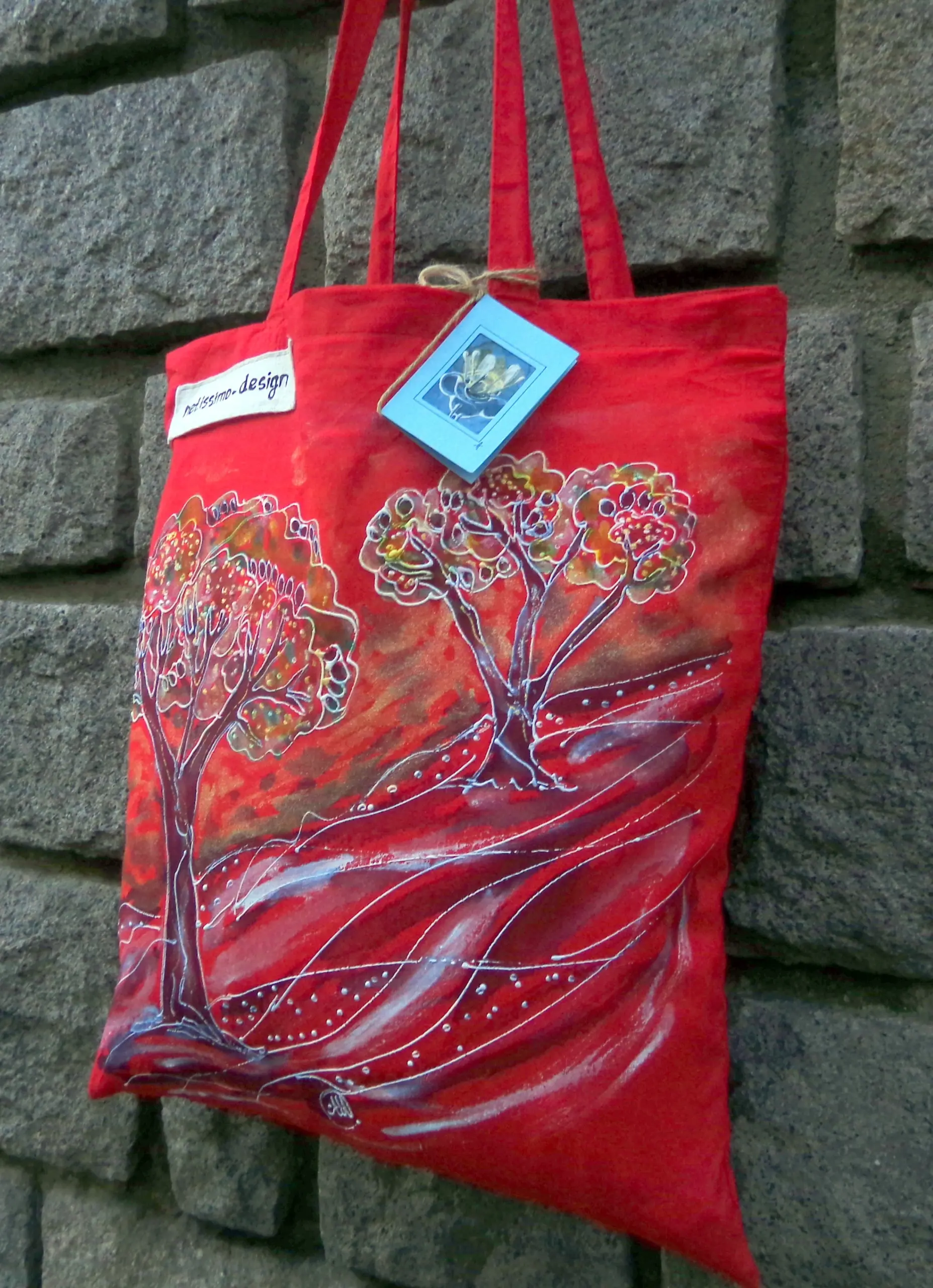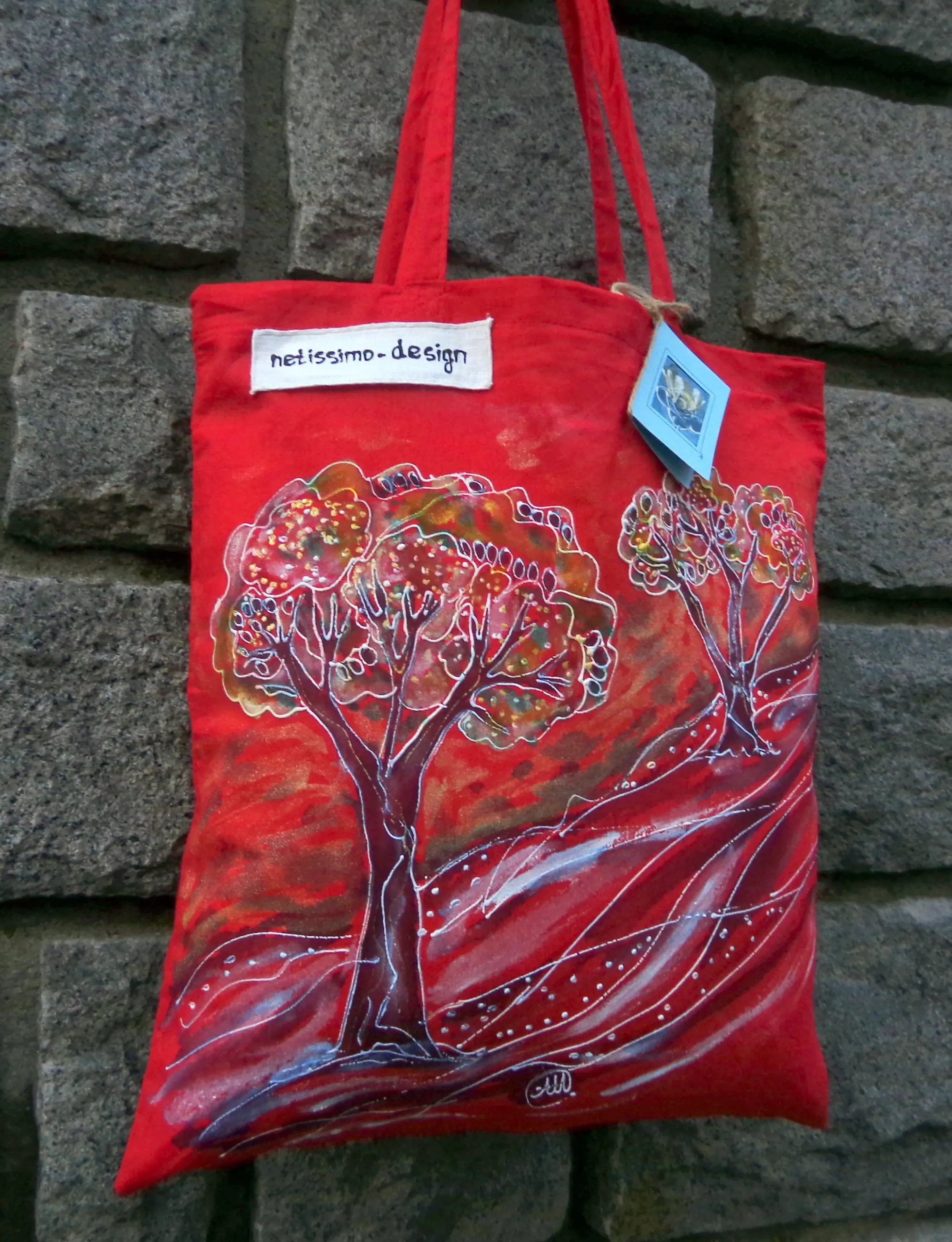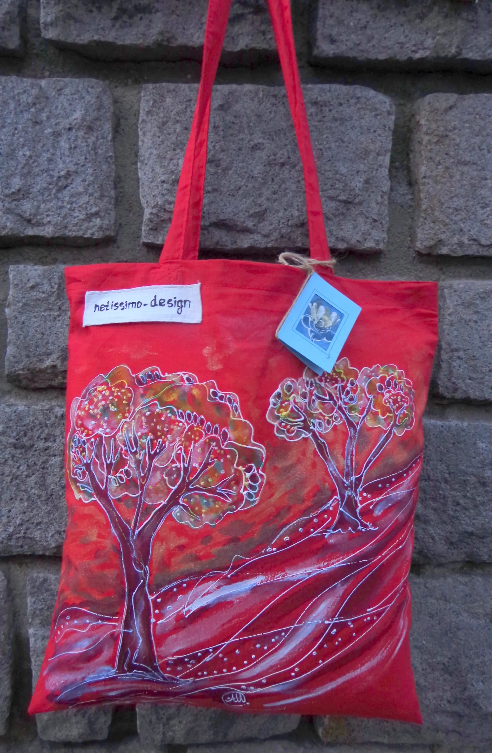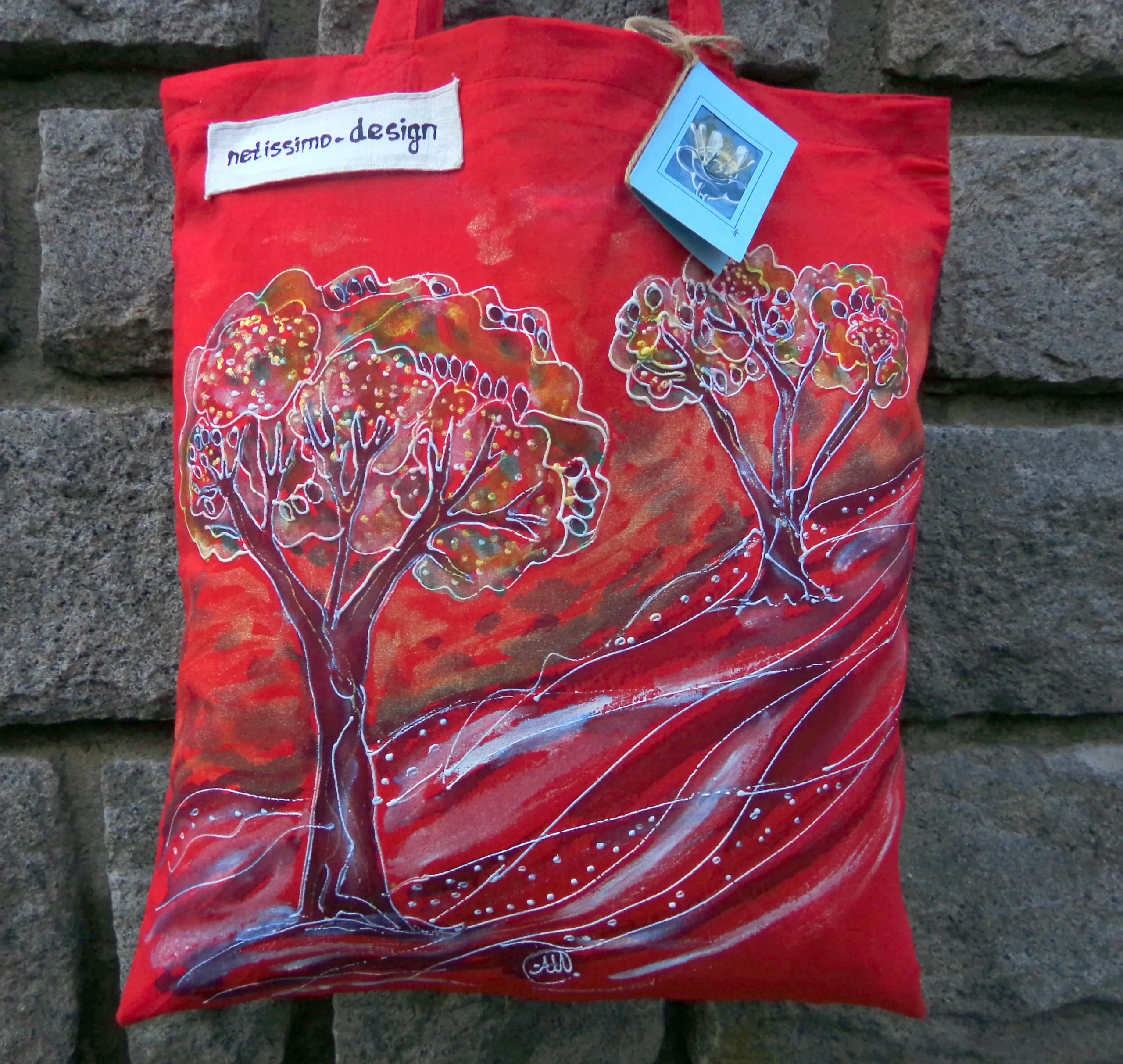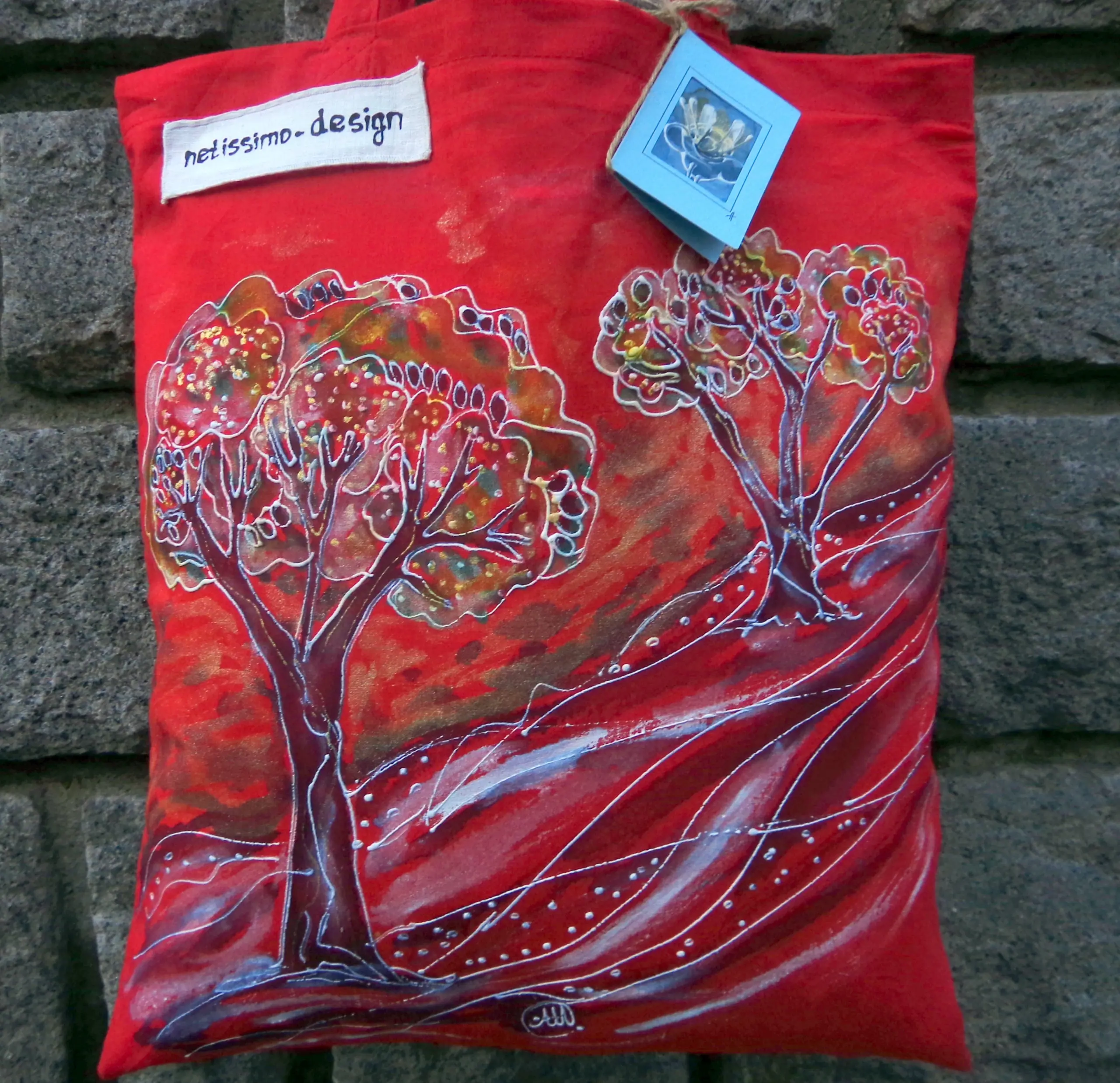 Всеки чанта е уникат, рисуван на ръка върху 100 % органичен памук с мотив.
