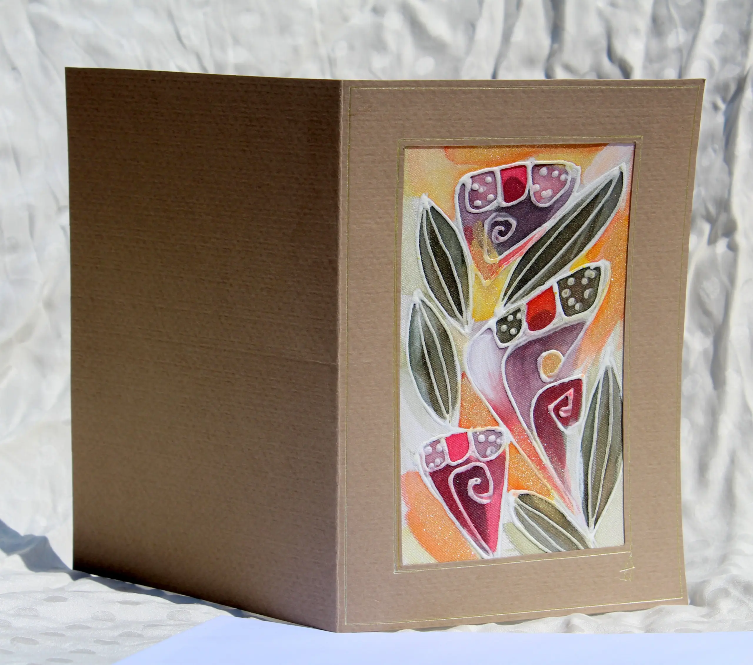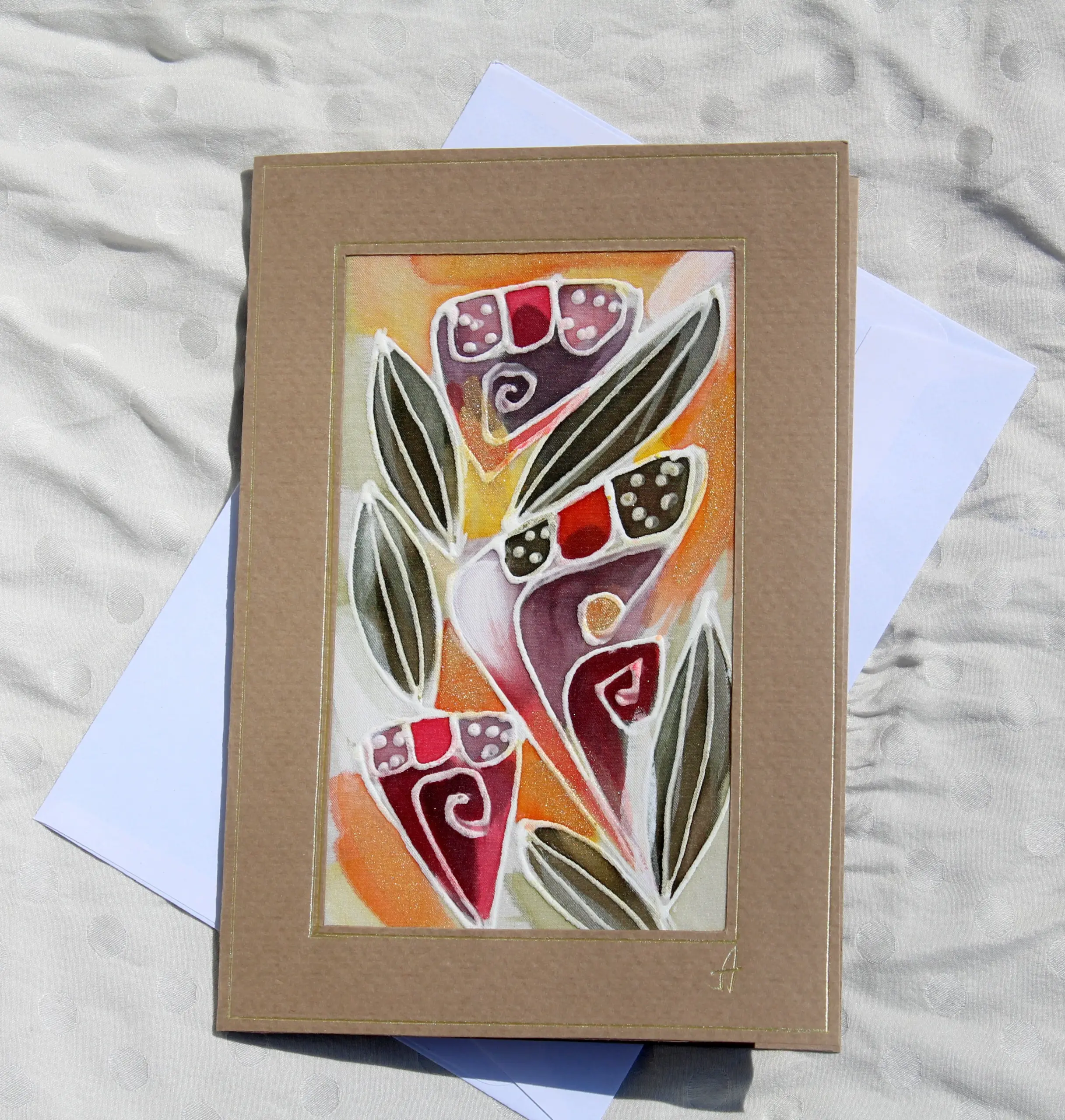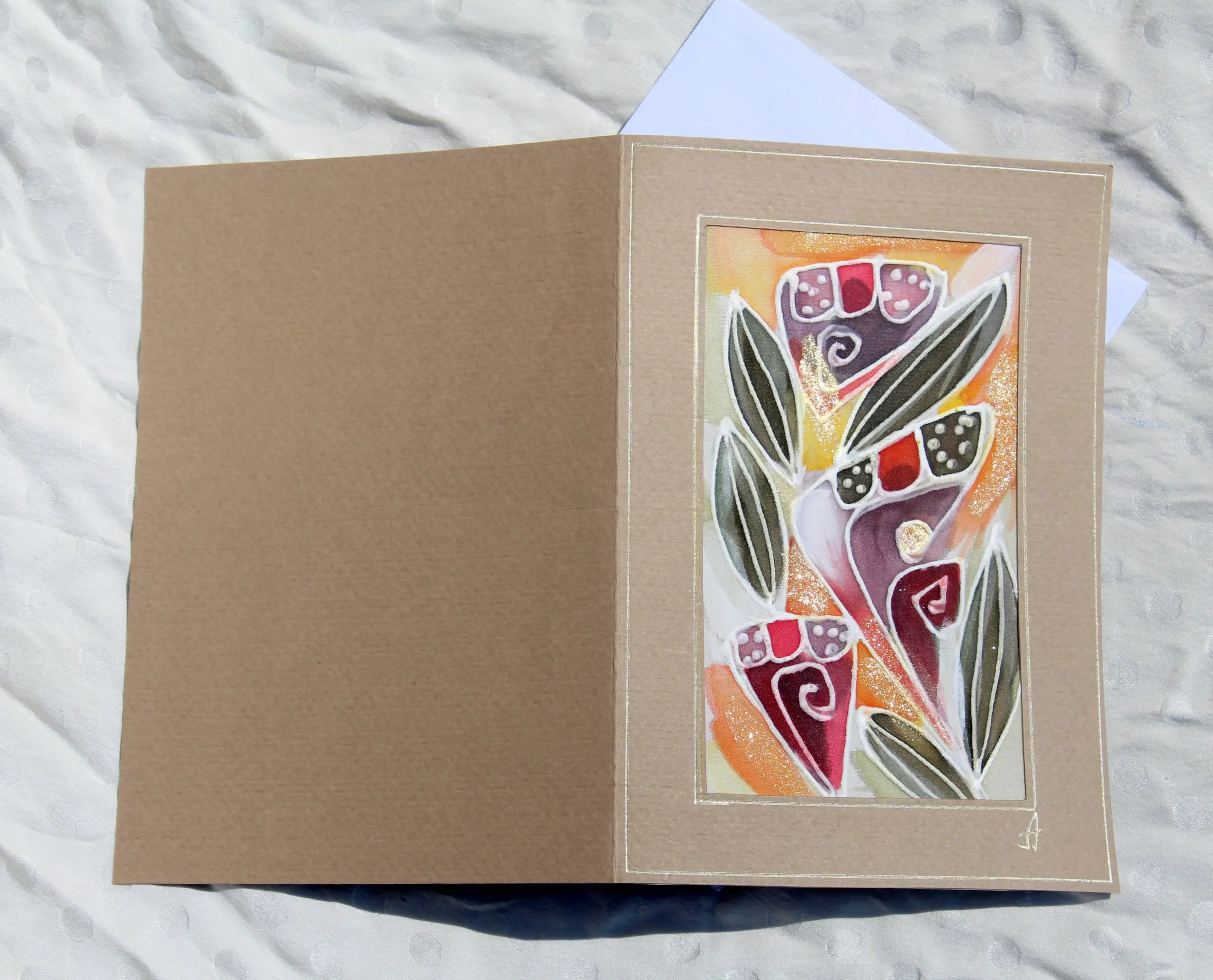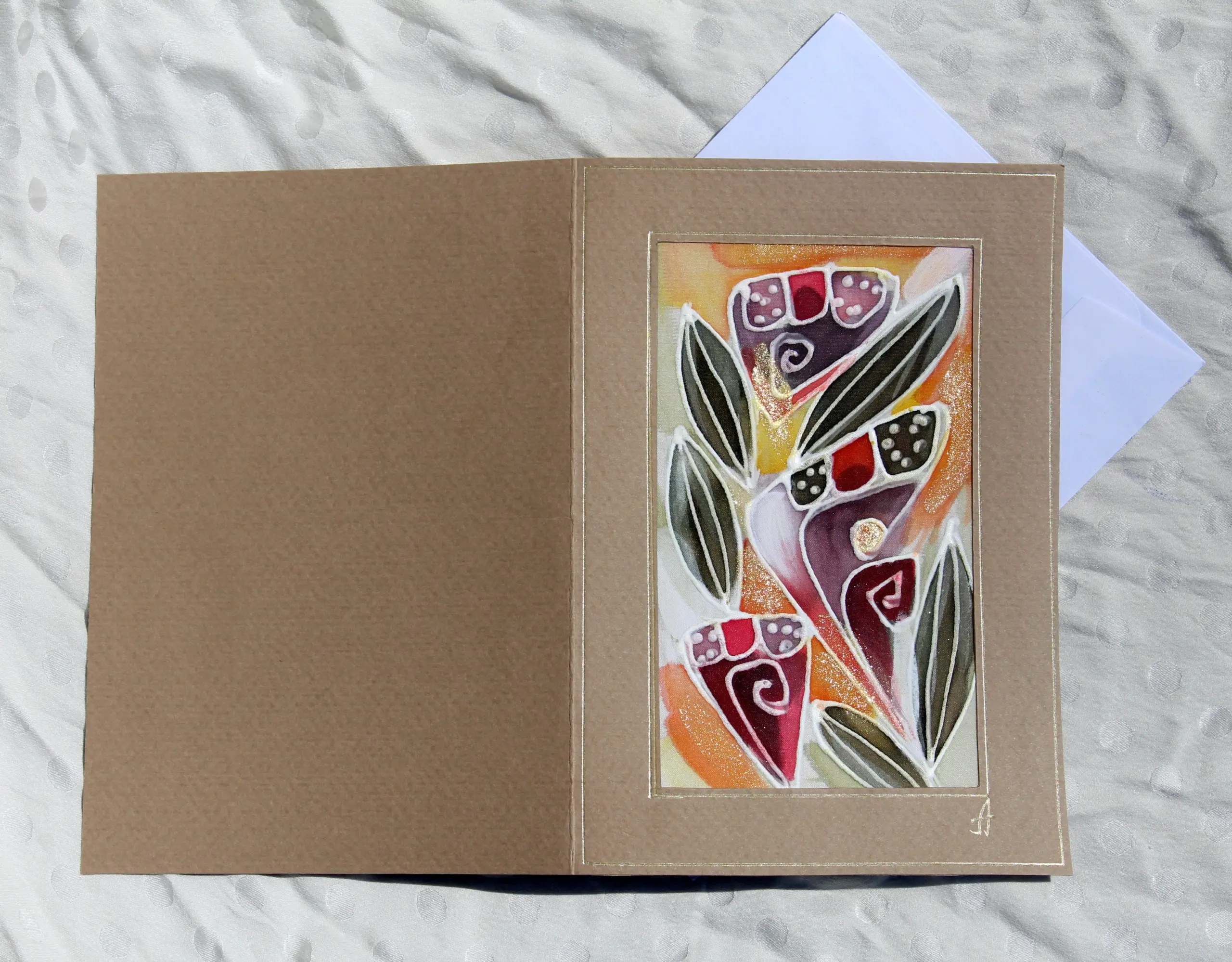 Всяка наша картичка е уникално ръчно рисувано произведение върху естествена коприна.Всяка изработка оставя своят отпечатък, който придава уникалност на всяка изработка.