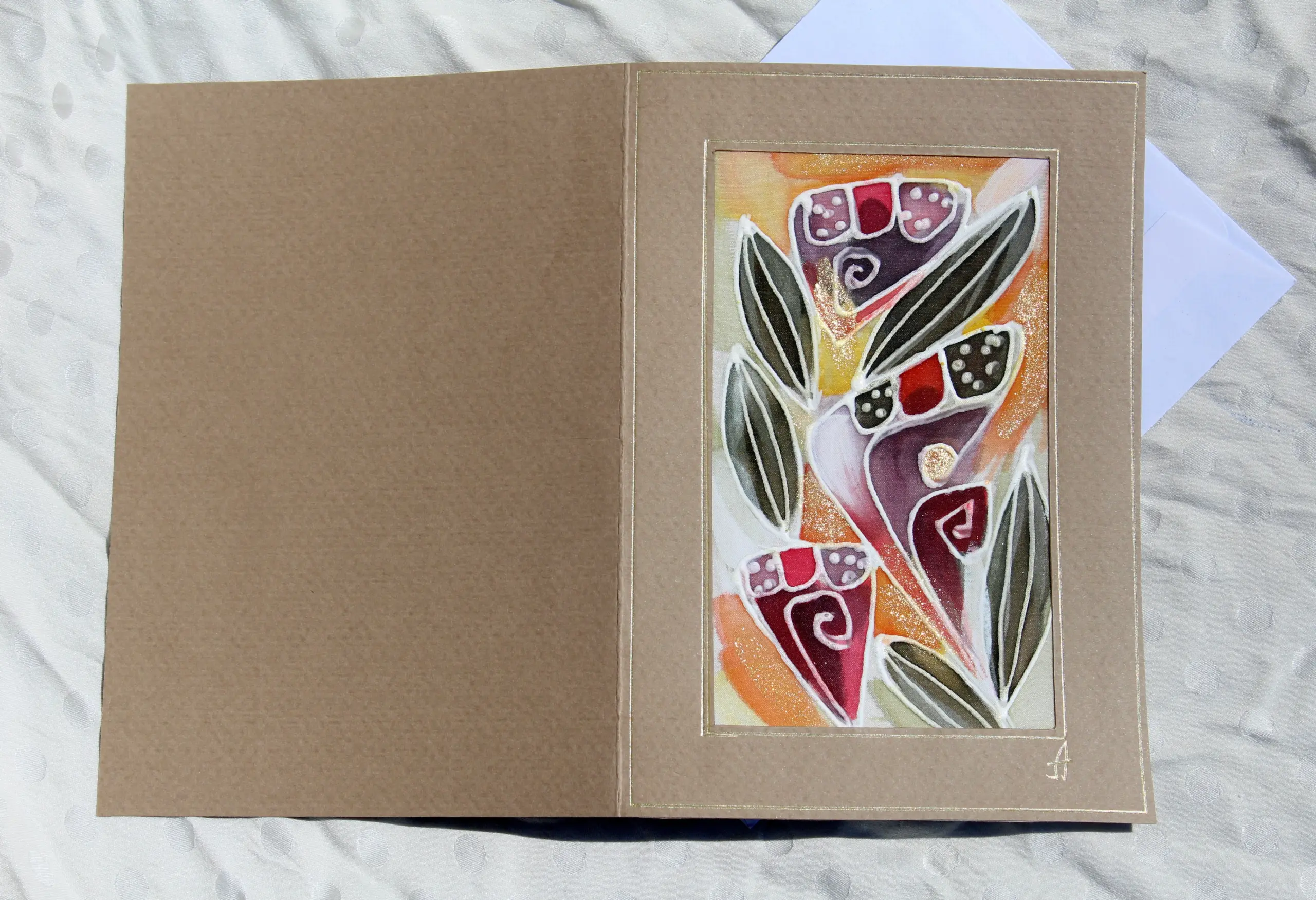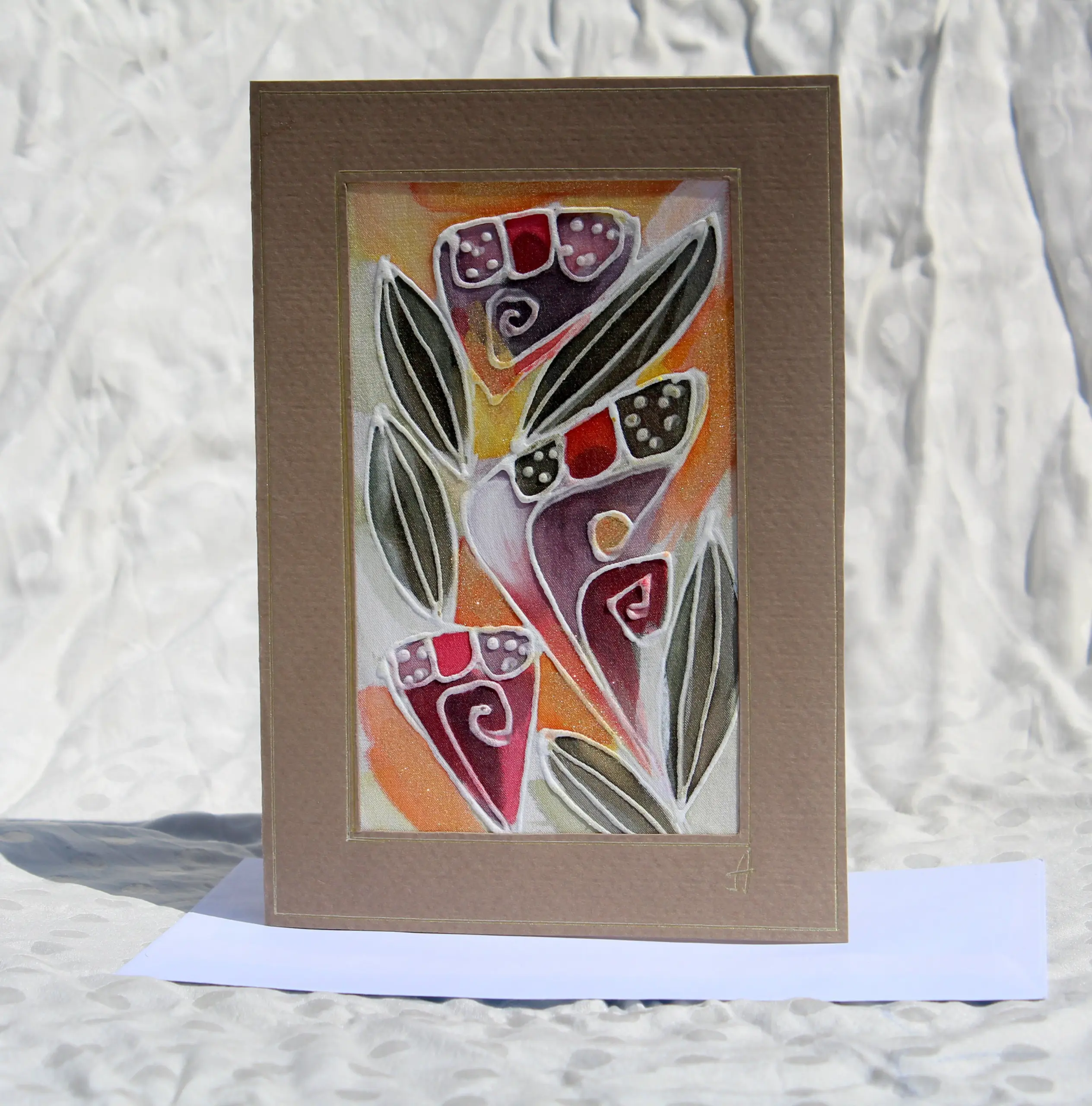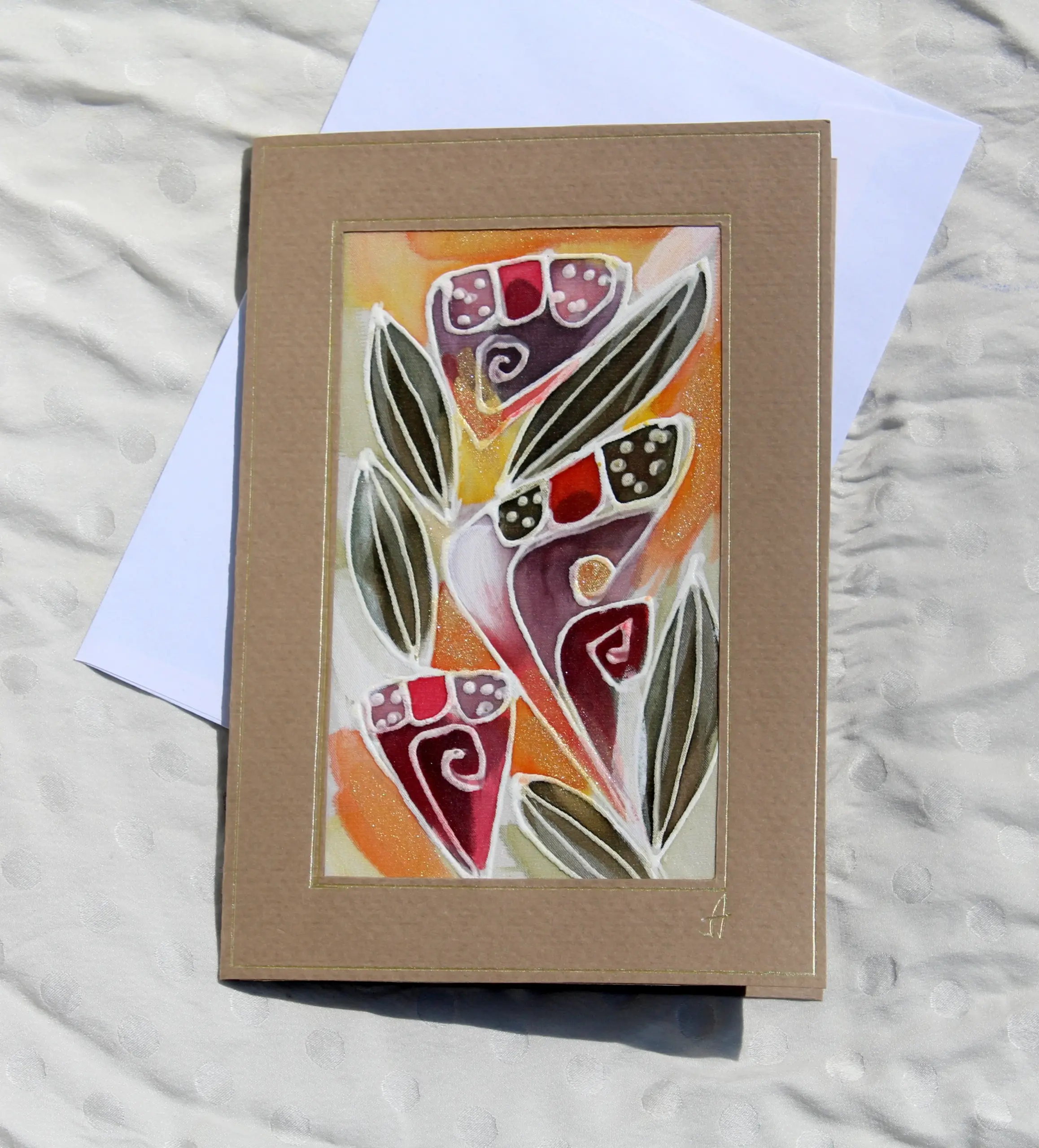 Всяка наша картичка е уникално ръчно рисувано произведение върху естествена коприна.Всяка изработка оставя своят отпечатък, който придава уникалност на всяка изработка.
