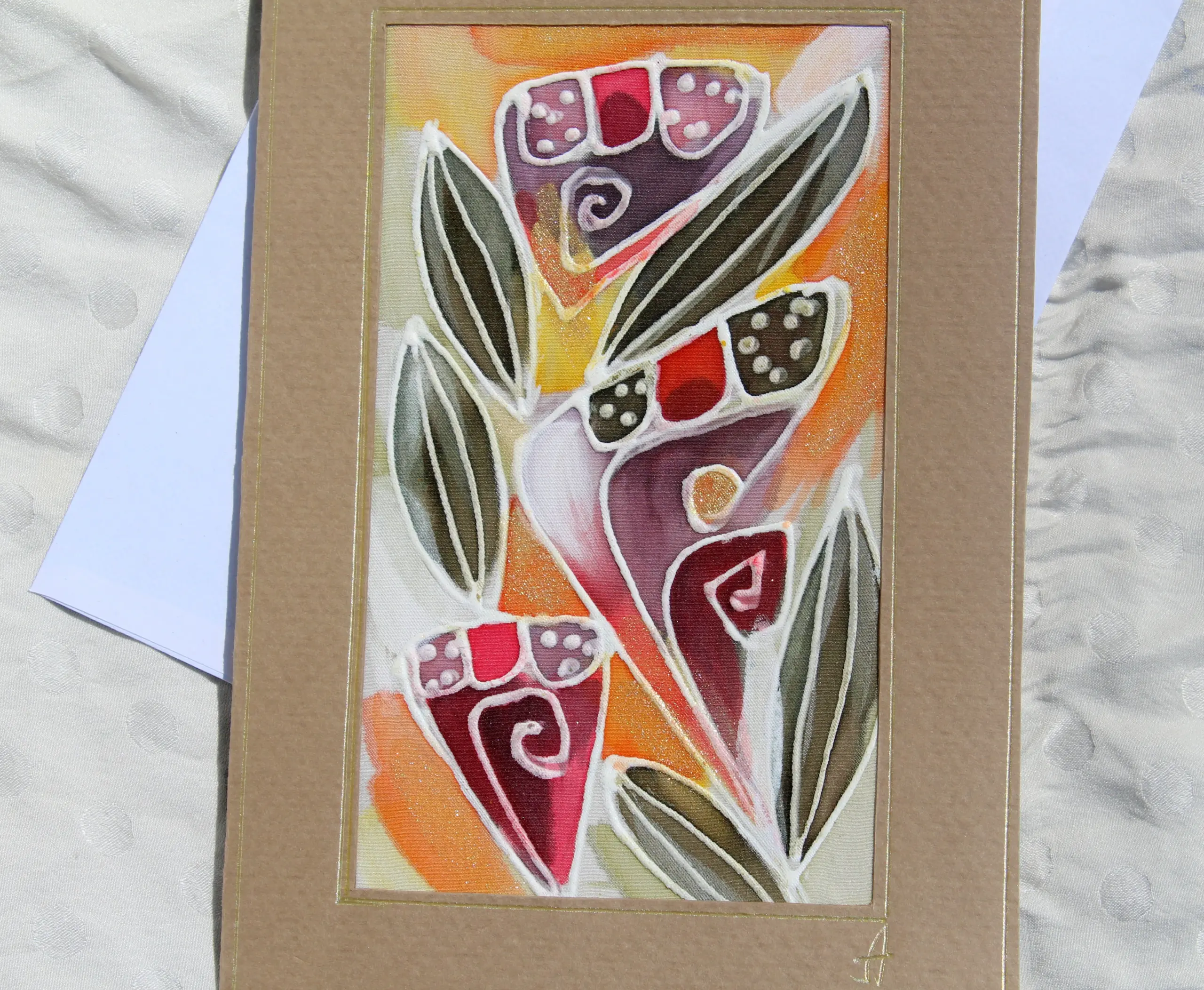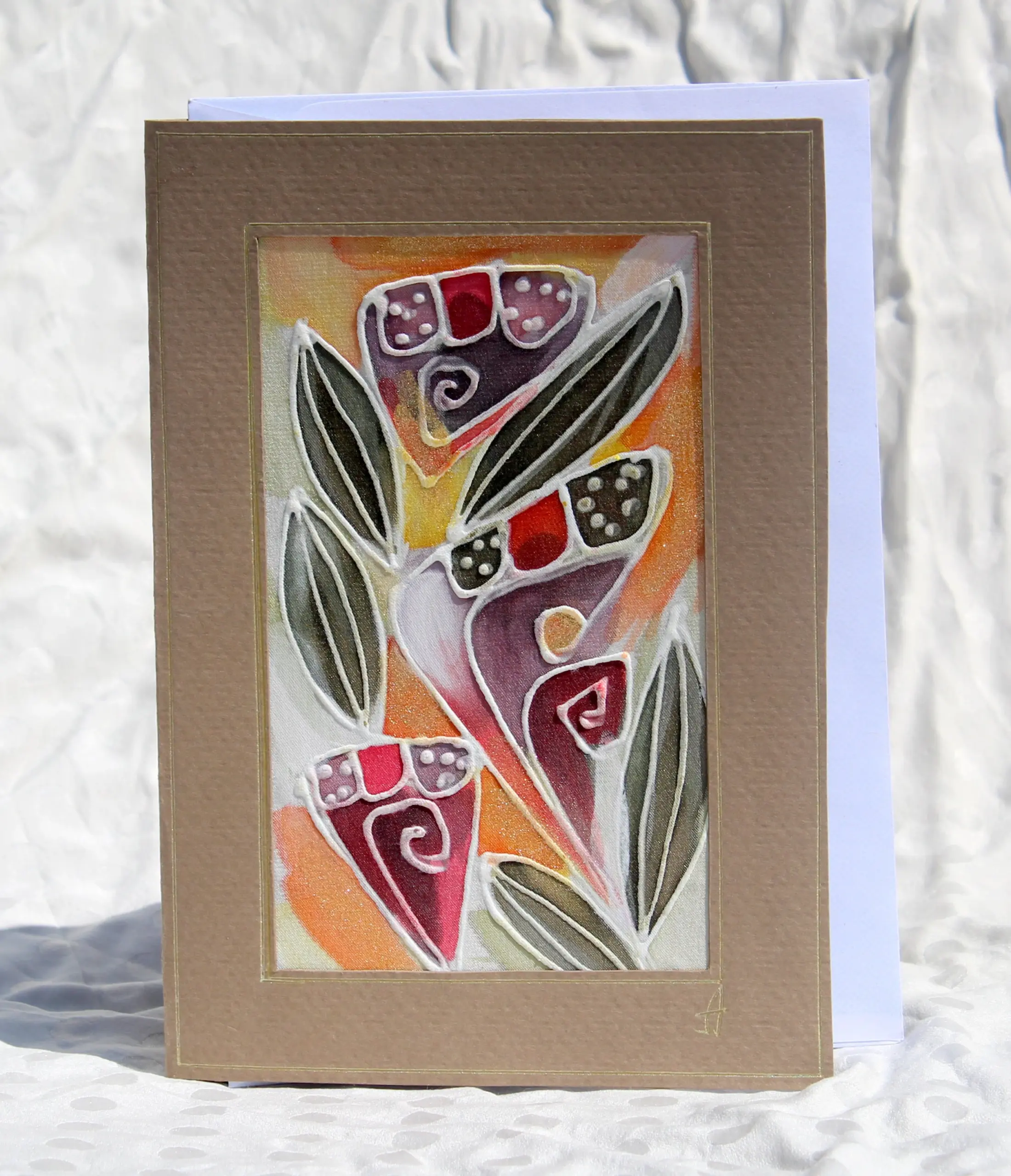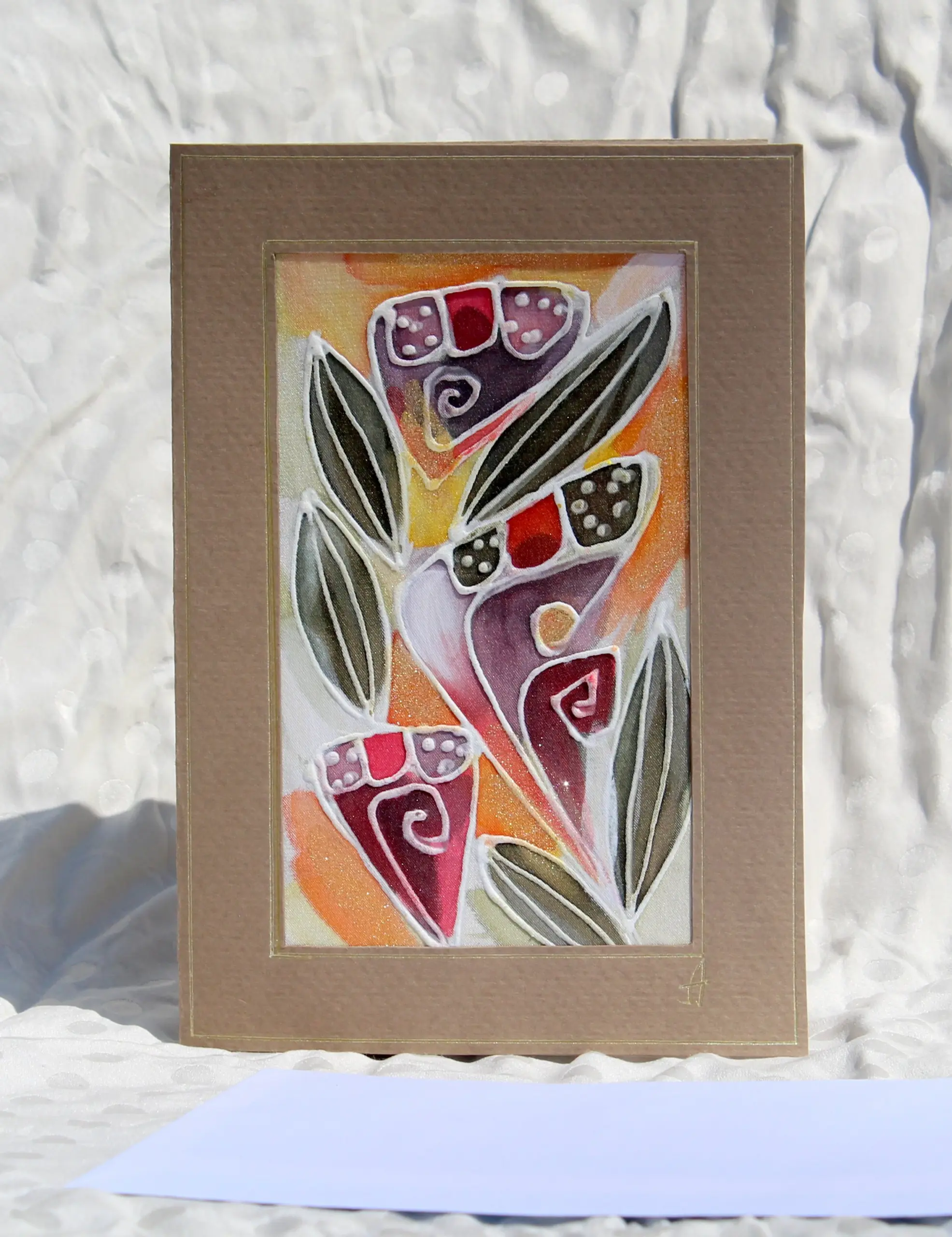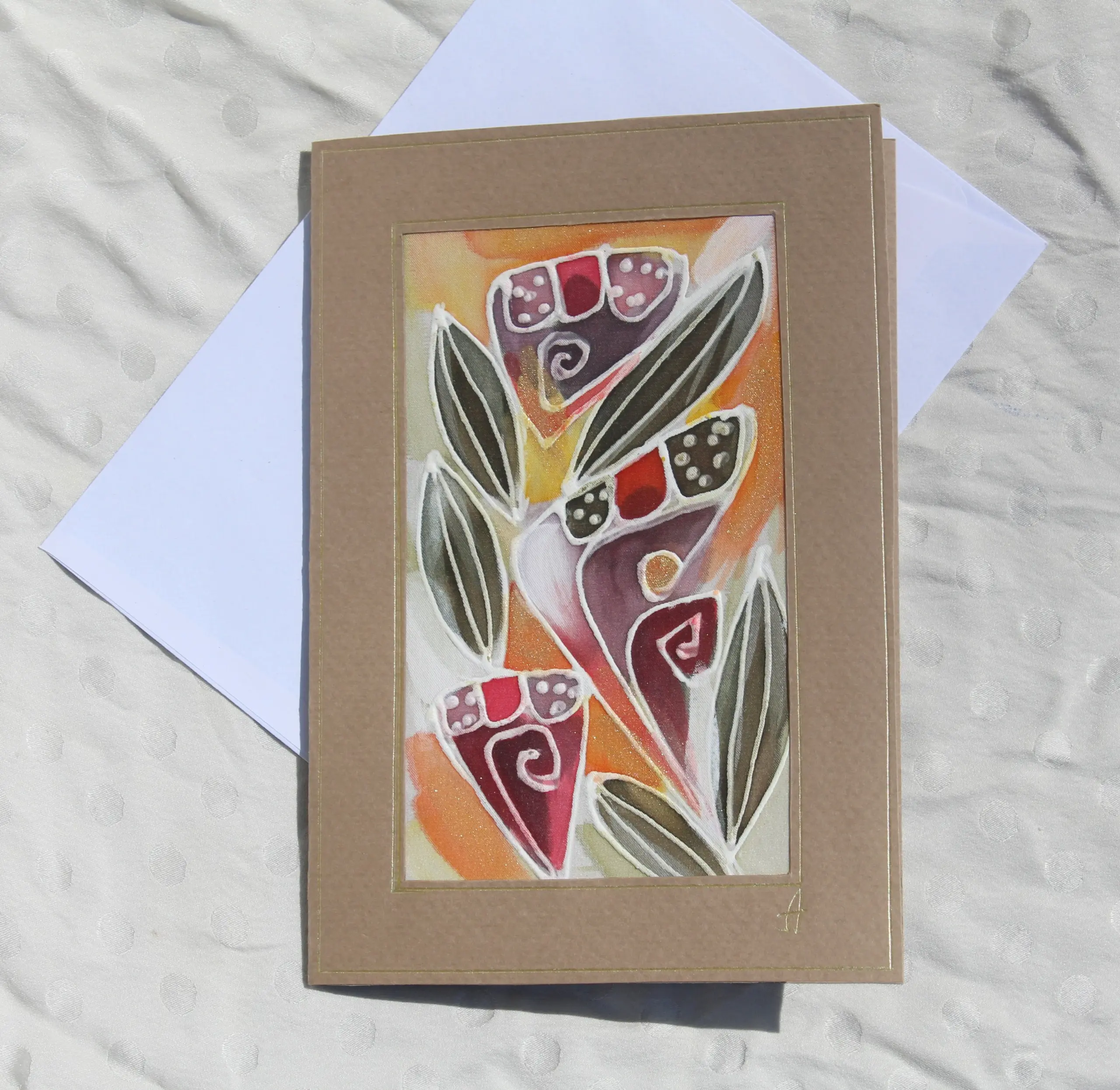 Всяка наша картичка е уникално ръчно рисувано произведение върху естествена коприна.Всяка изработка оставя своят отпечатък, който придава уникалност на всяка изработка.