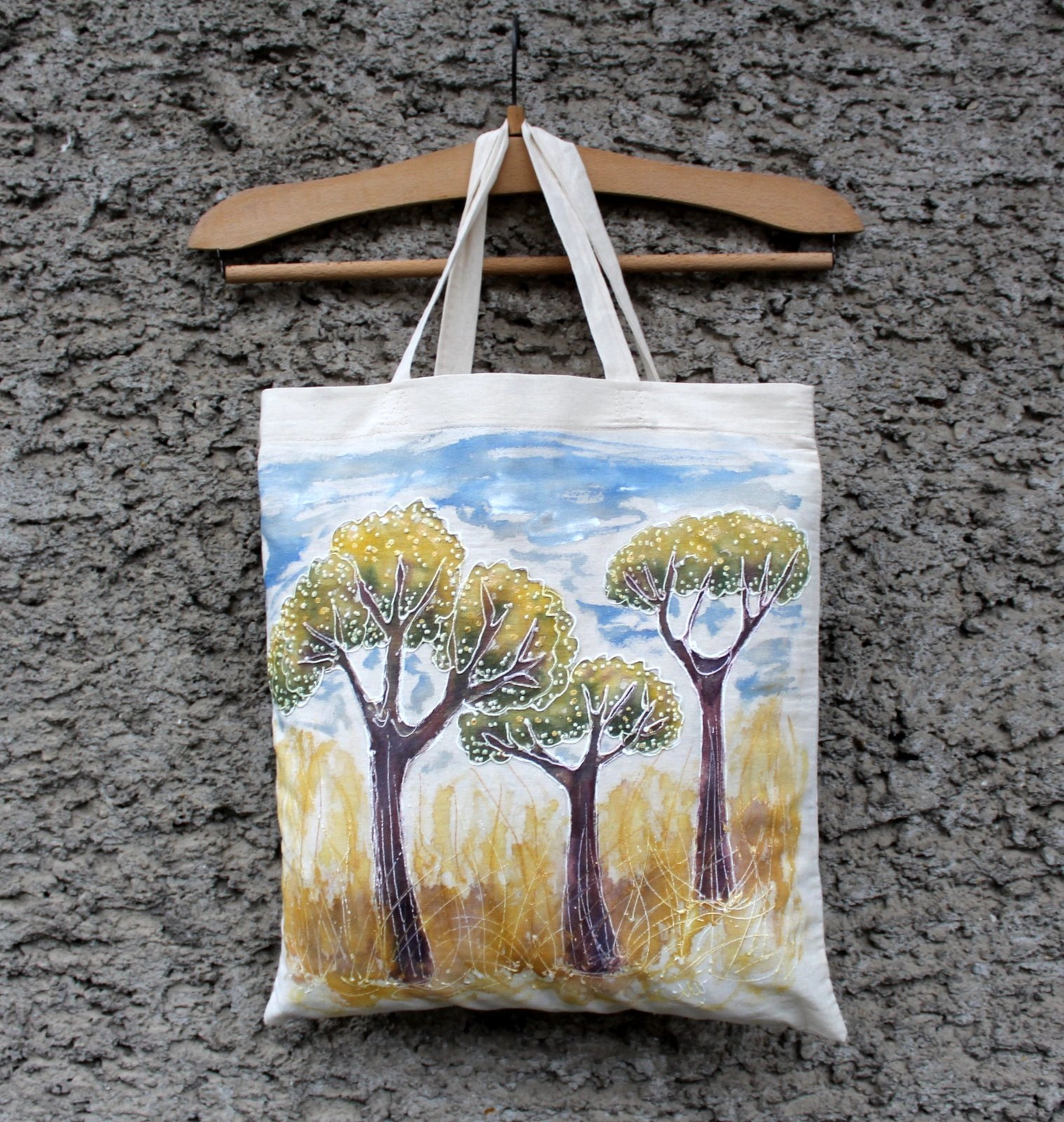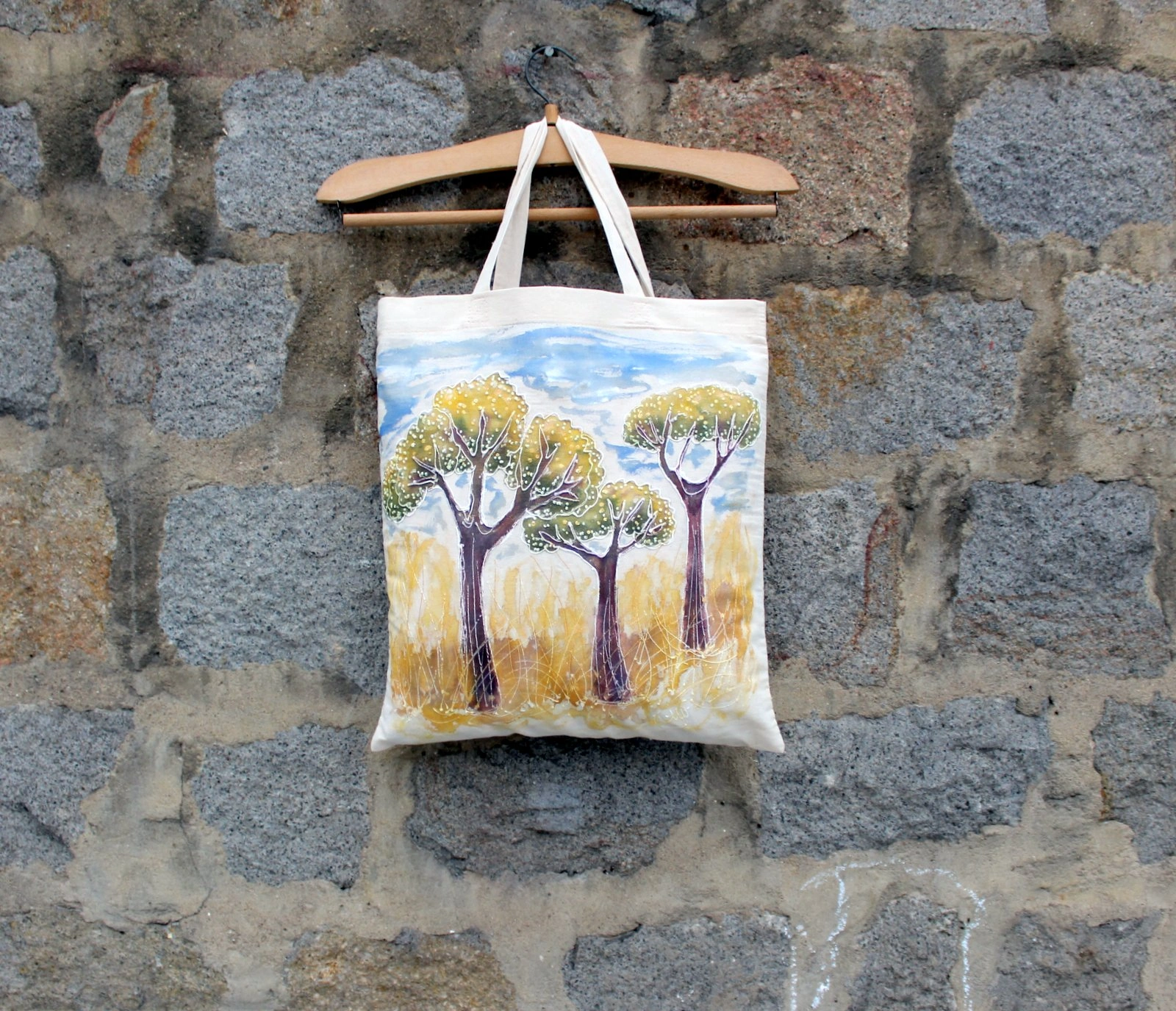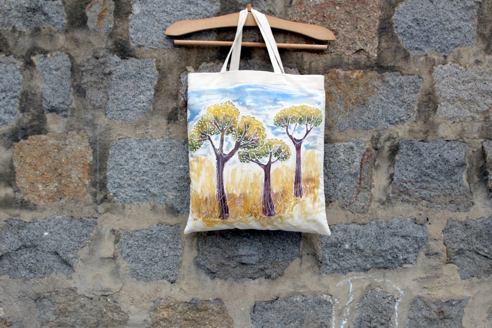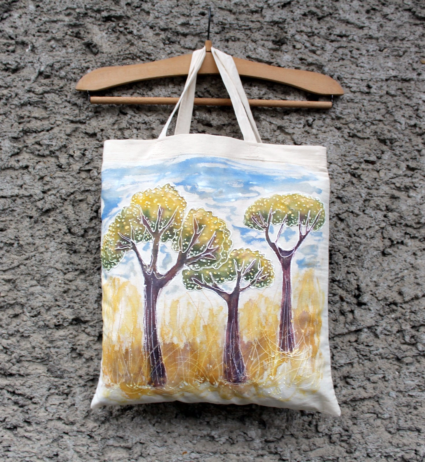 Всяка чанта е уникат, рисувано на ръка върху 100 % органичен памук с мотив. Един от ключовите елементи на символиката на дървото е в хармонията. Тя представя връзката между земята и небето,физическото и духовното,смъртта и възраждането. Корените на дървото се укрепват в земята,символизиращи стабилност и практичност,докато клоните и листата се простират към небето, символизиращи стремеж към духовното и творчеството.
