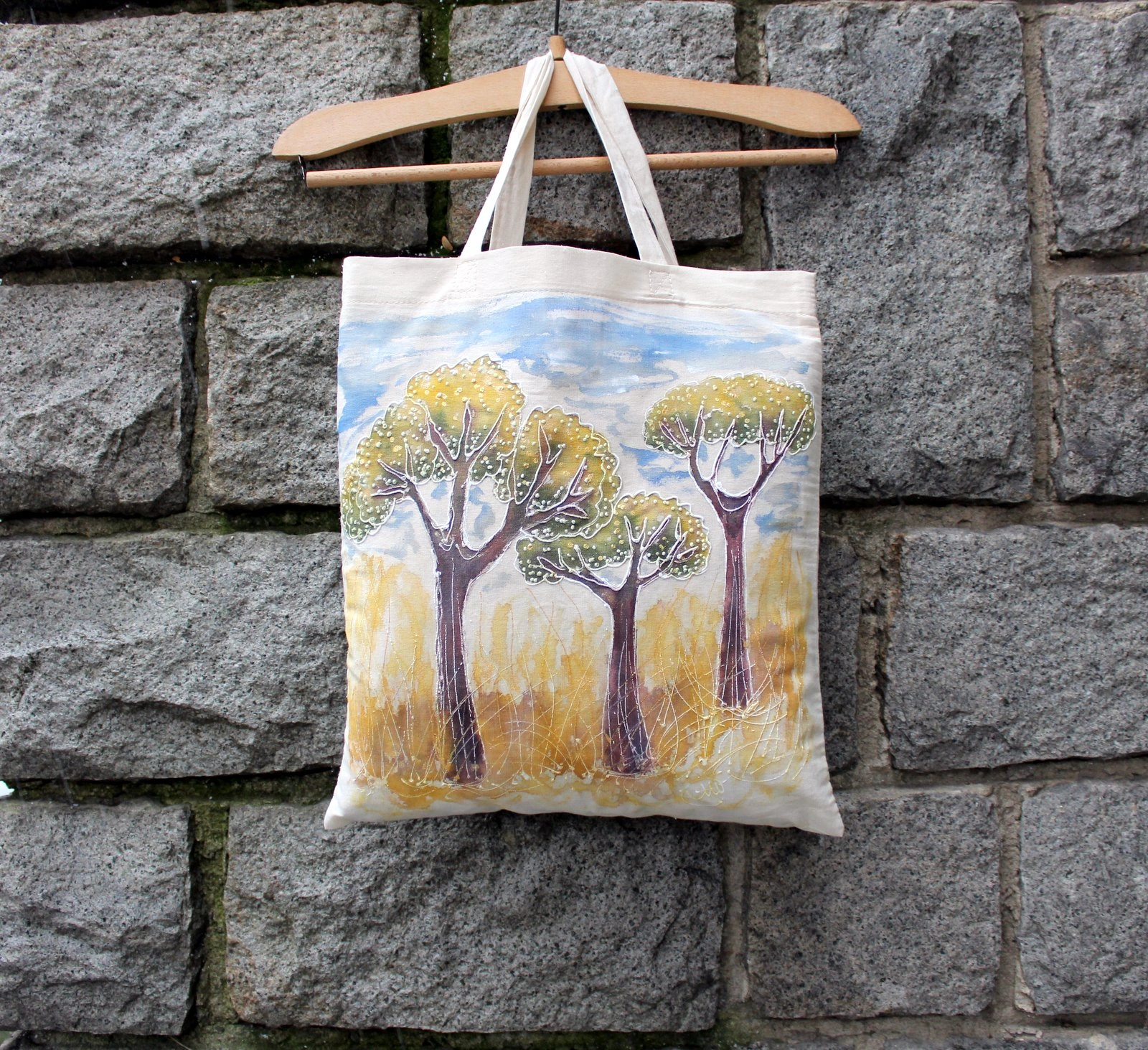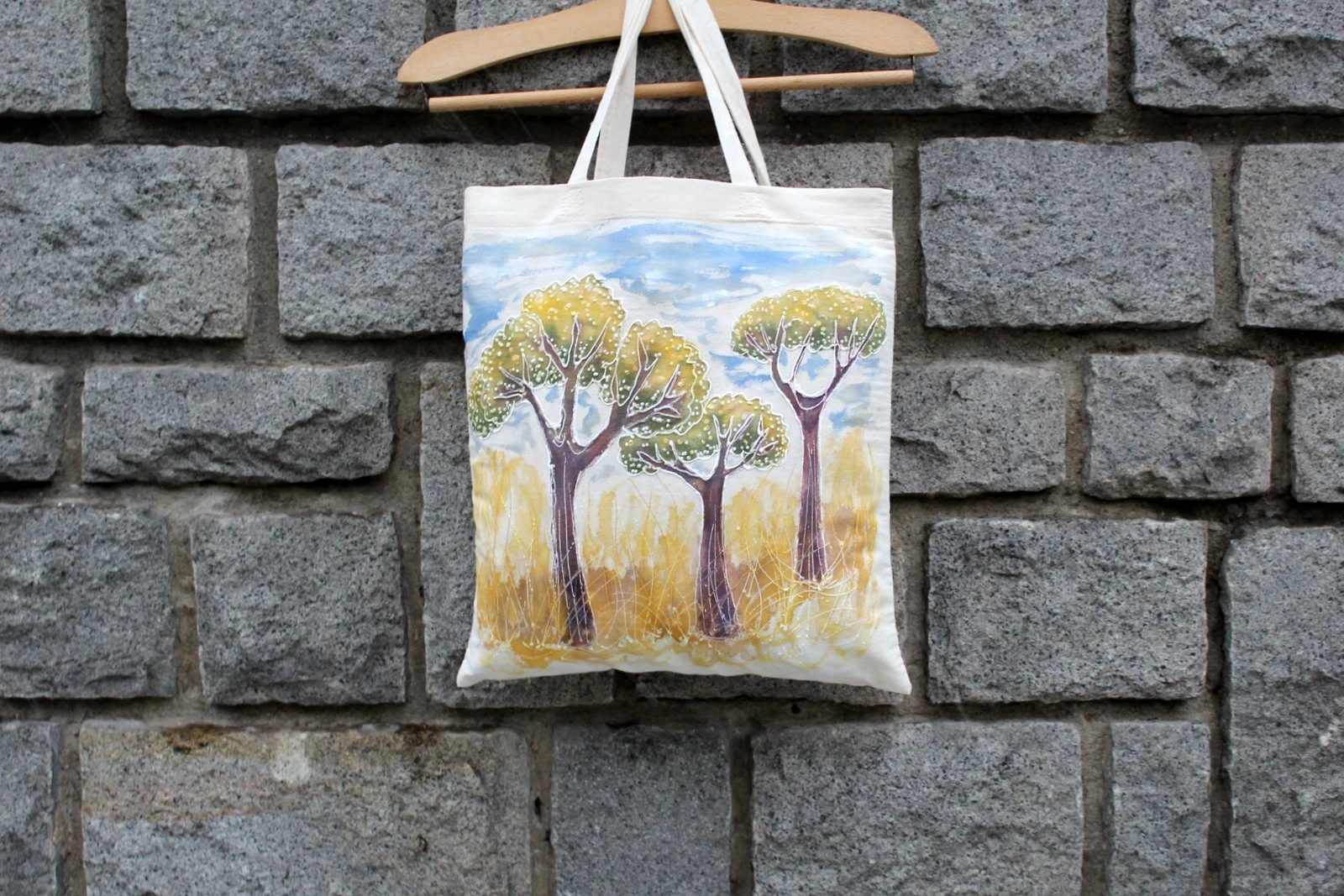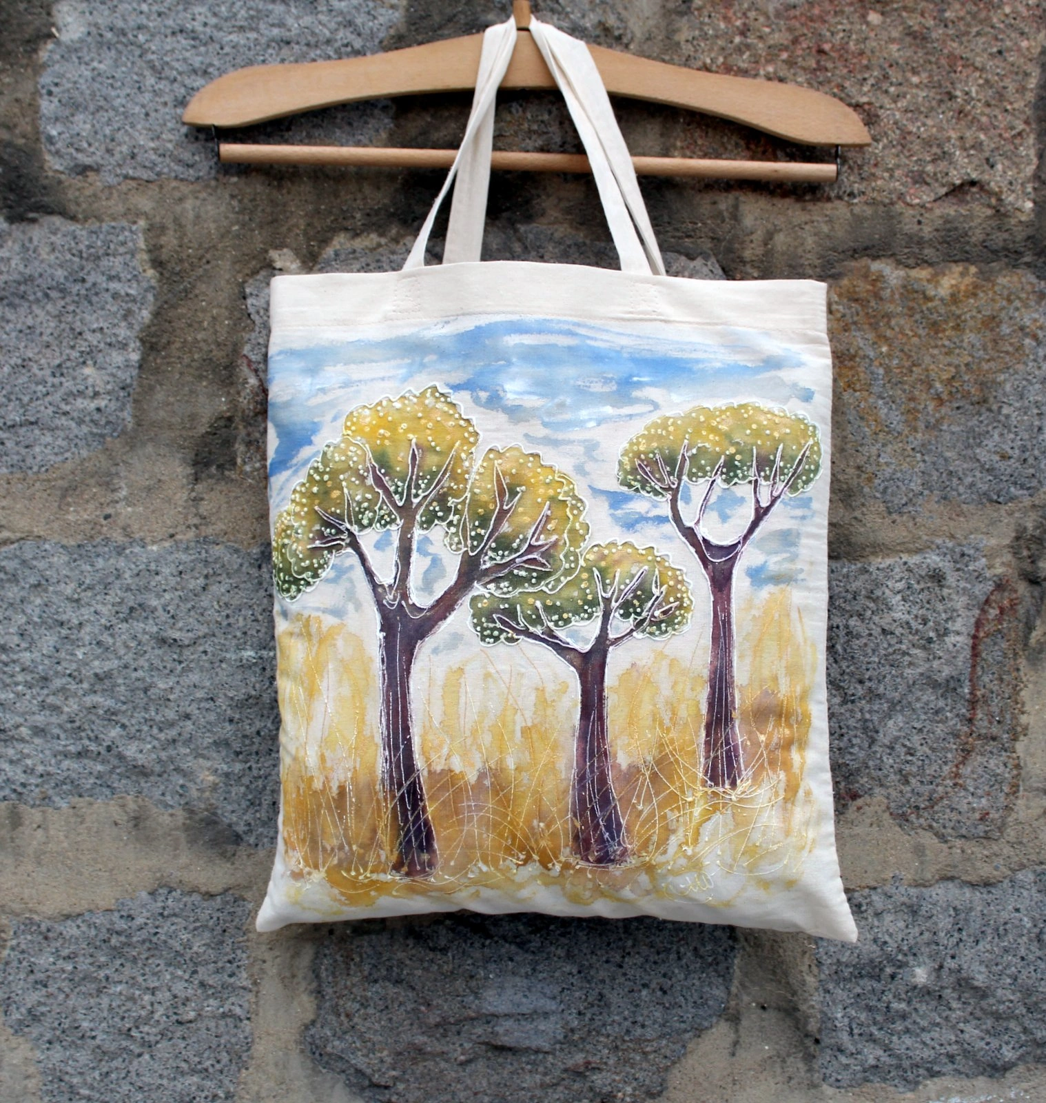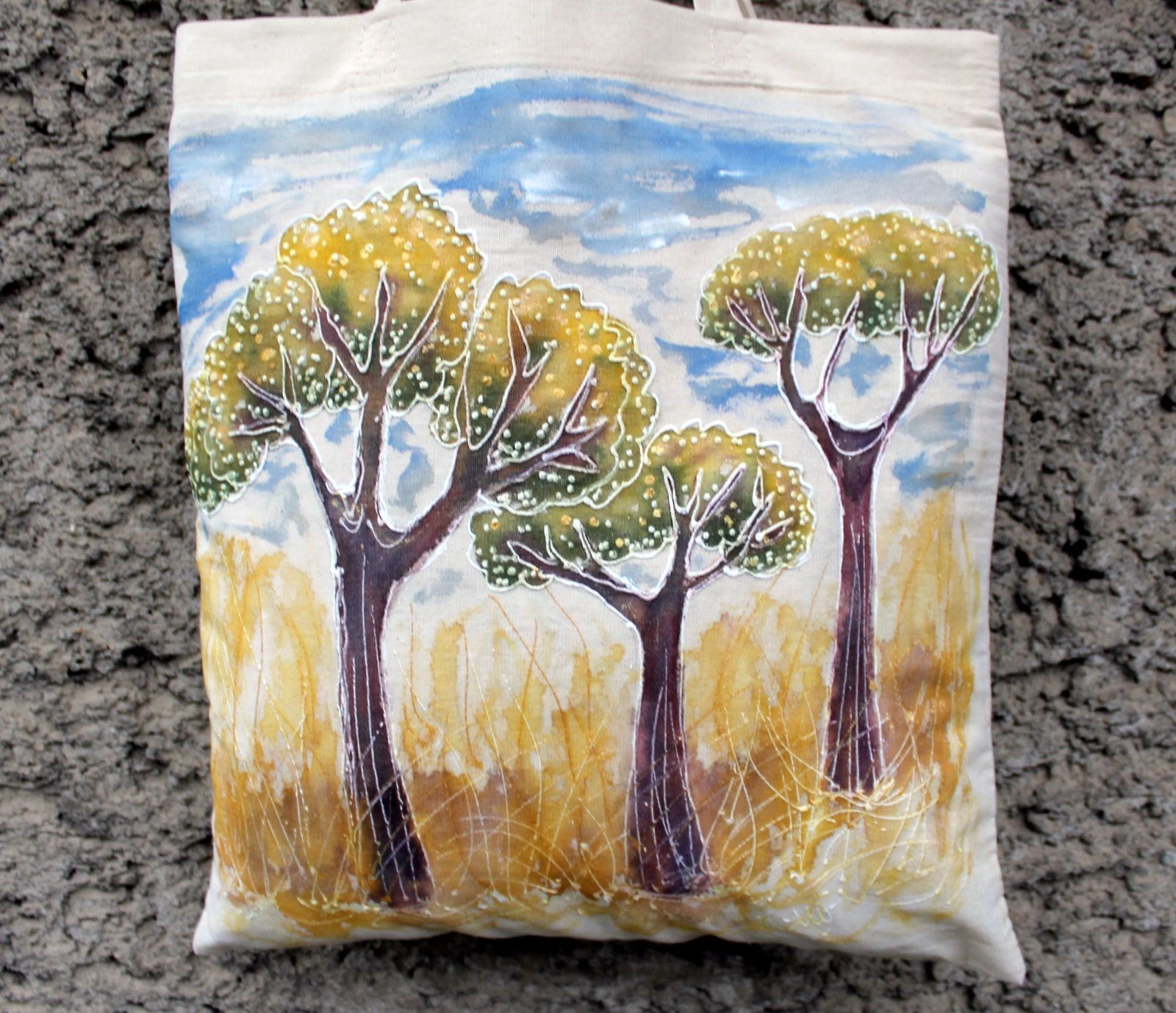 Всяка чанта е уникат, рисувано на ръка върху 100 % органичен памук с мотив. Един от ключовите елементи на символиката на дървото е в хармонията. Тя представя връзката между земята и небето,физическото и духовното,смъртта и възраждането. Корените на дървото се укрепват в земята,символизиращи стабилност и практичност,докато клоните и листата се простират към небето, символизиращи стремеж към духовното и творчеството.