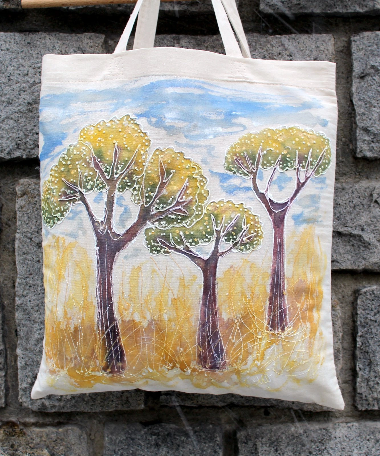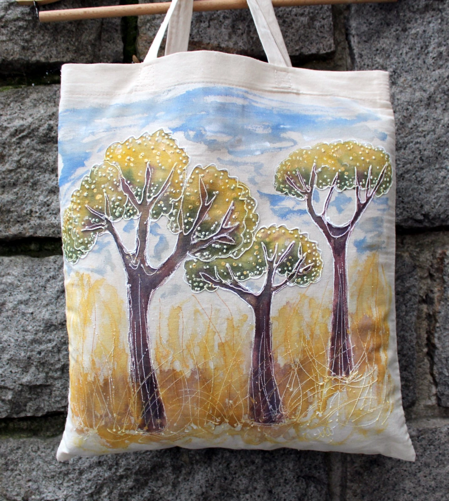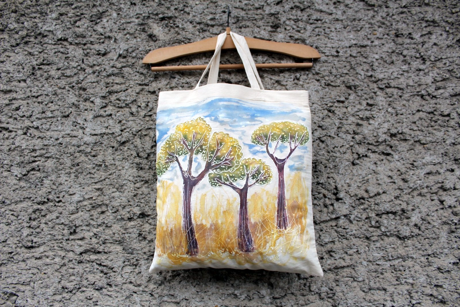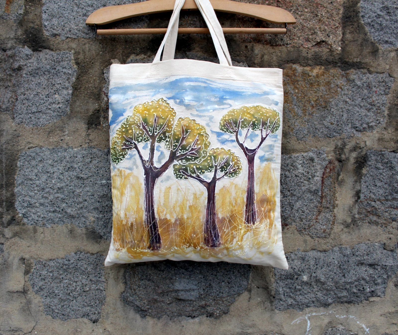 Всяка чанта е уникат, рисувано на ръка върху 100 % органичен памук с мотив. Един от ключовите елементи на символиката на дървото е в хармонията. Тя представя връзката между земята и небето,физическото и духовното,смъртта и възраждането. Корените на дървото се укрепват в земята,символизиращи стабилност и практичност,докато клоните и листата се простират към небето, символизиращи стремеж към духовното и творчеството.