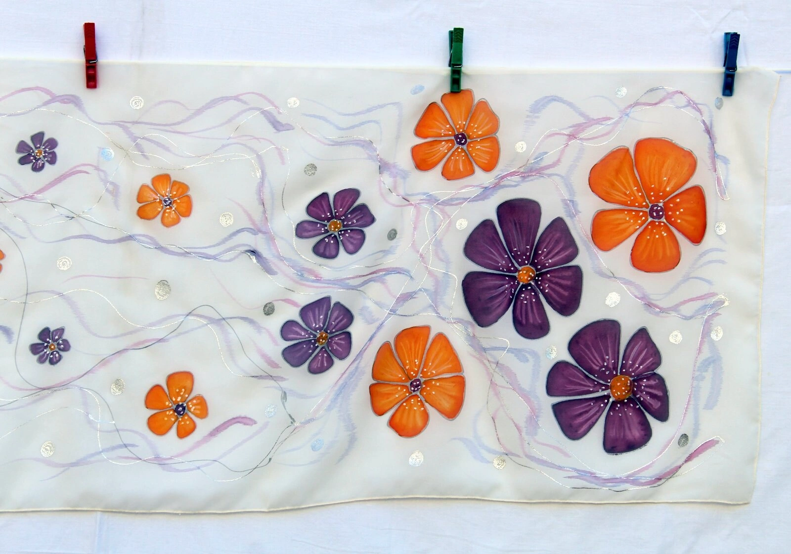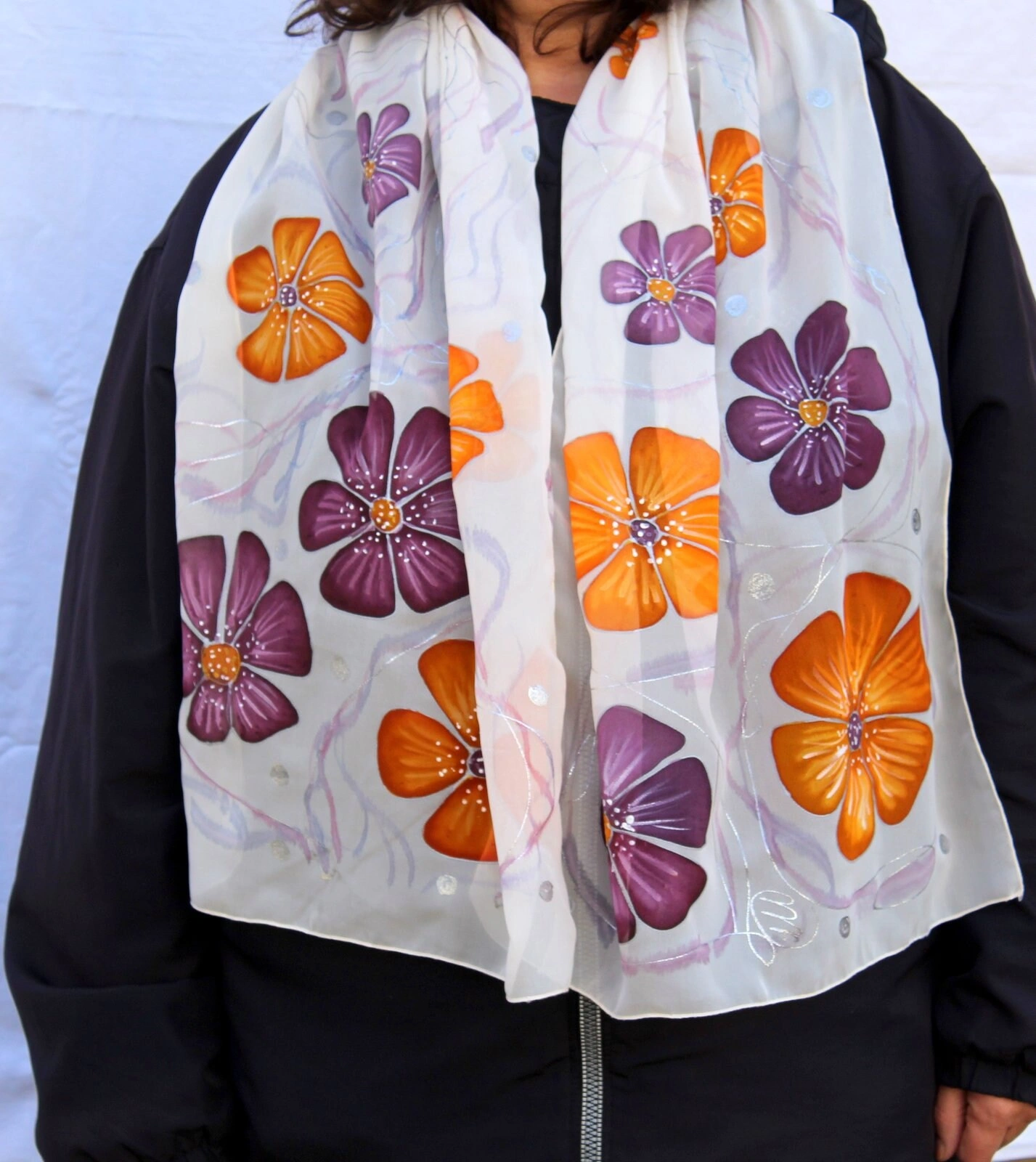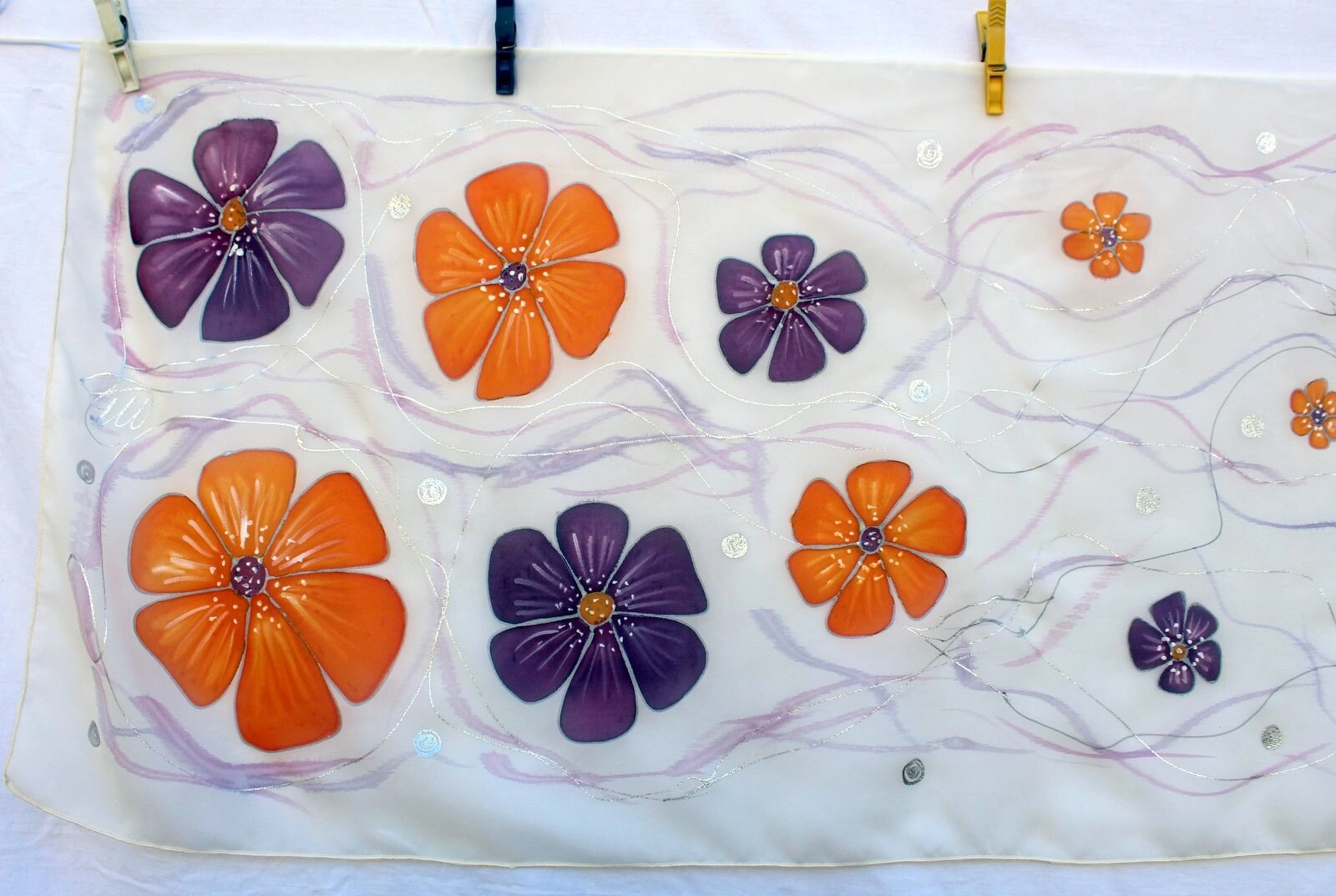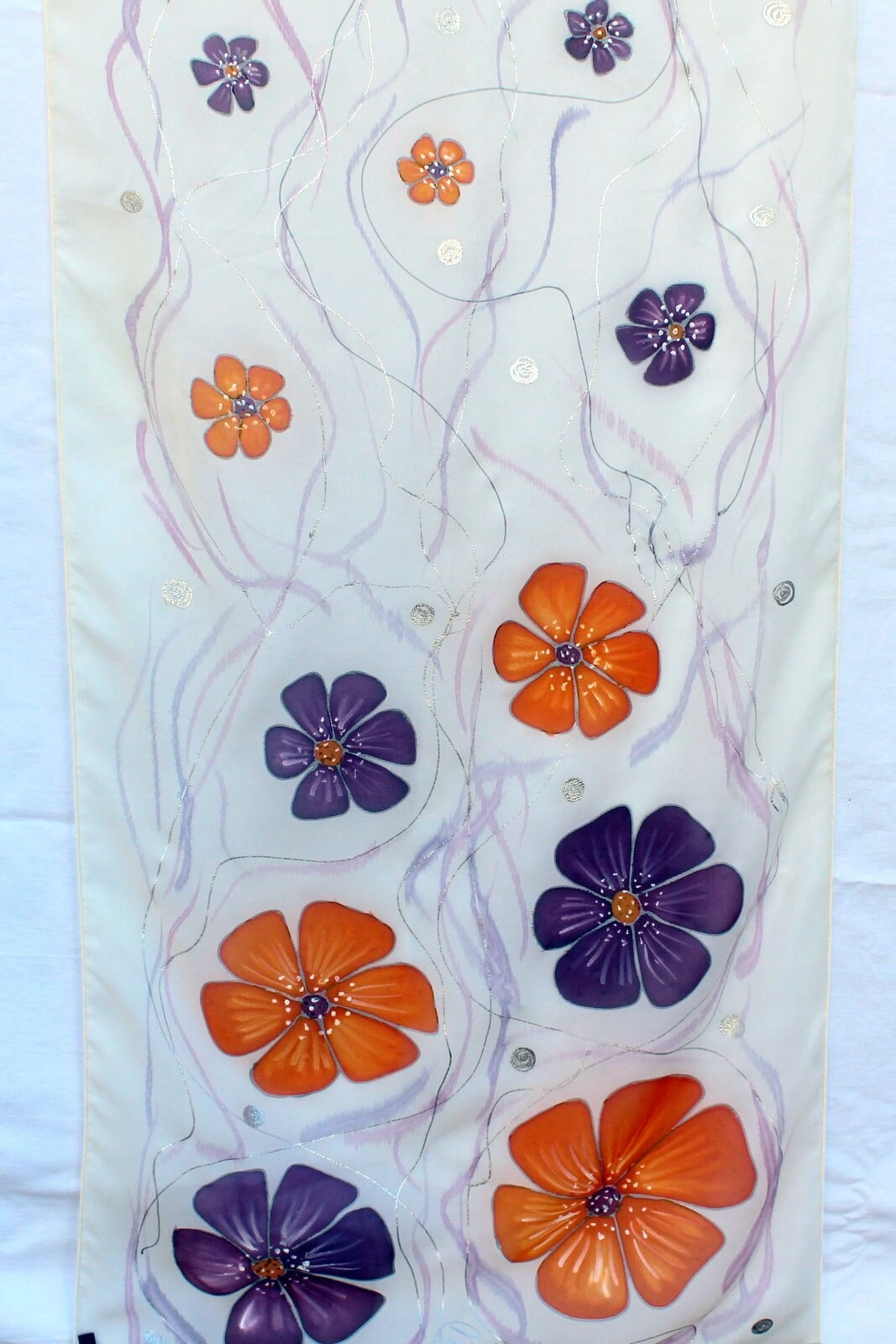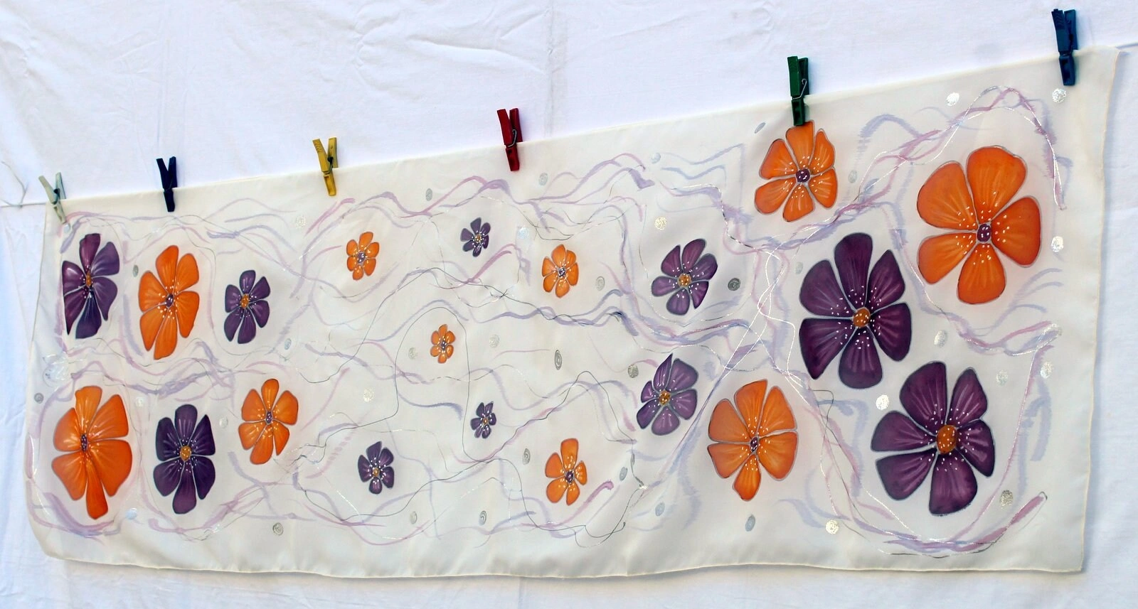 “Лилави и Оранжеви цветя”. Копринен шал с размер 140×40см.