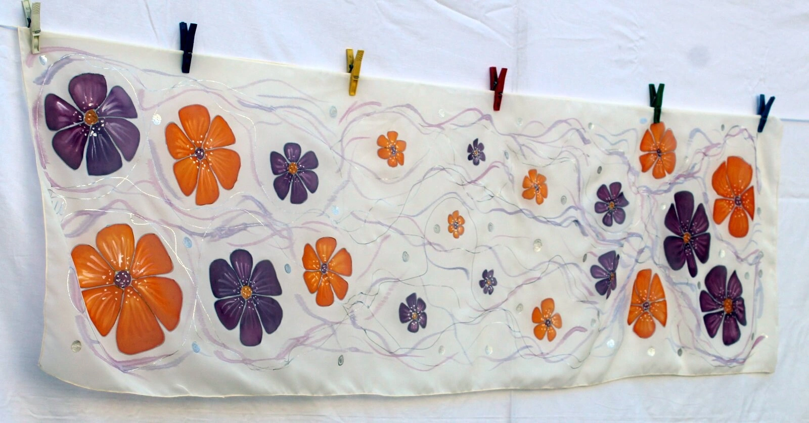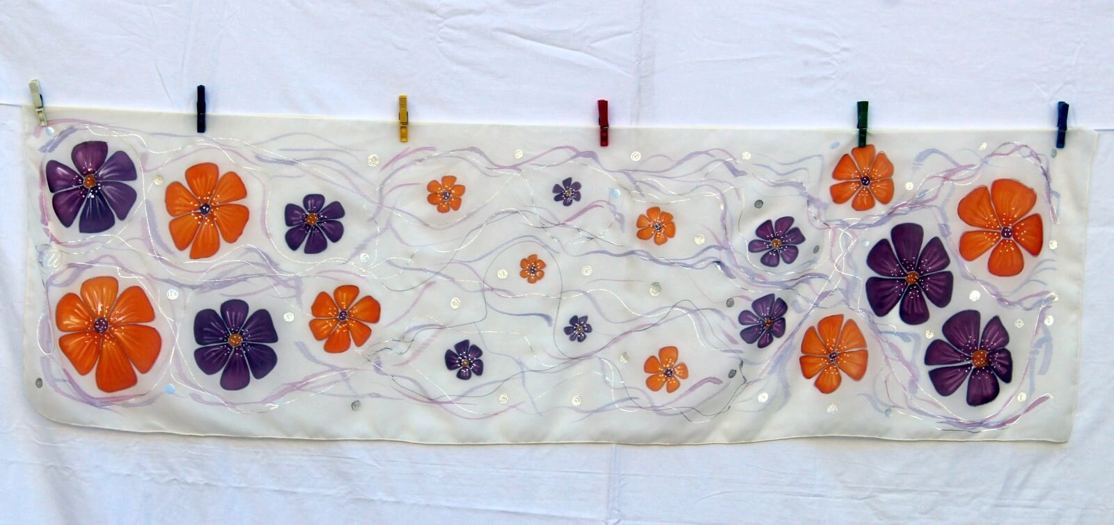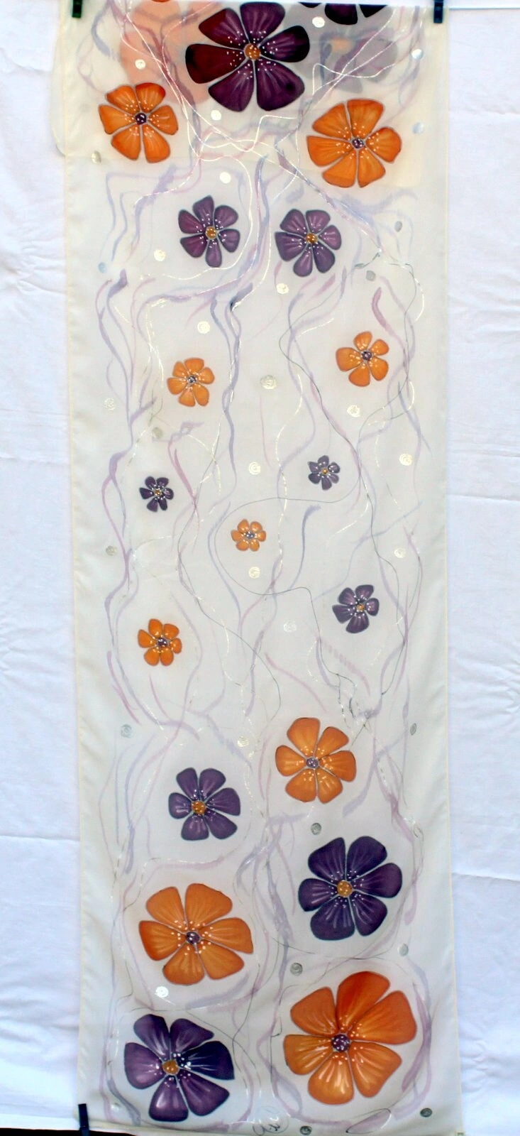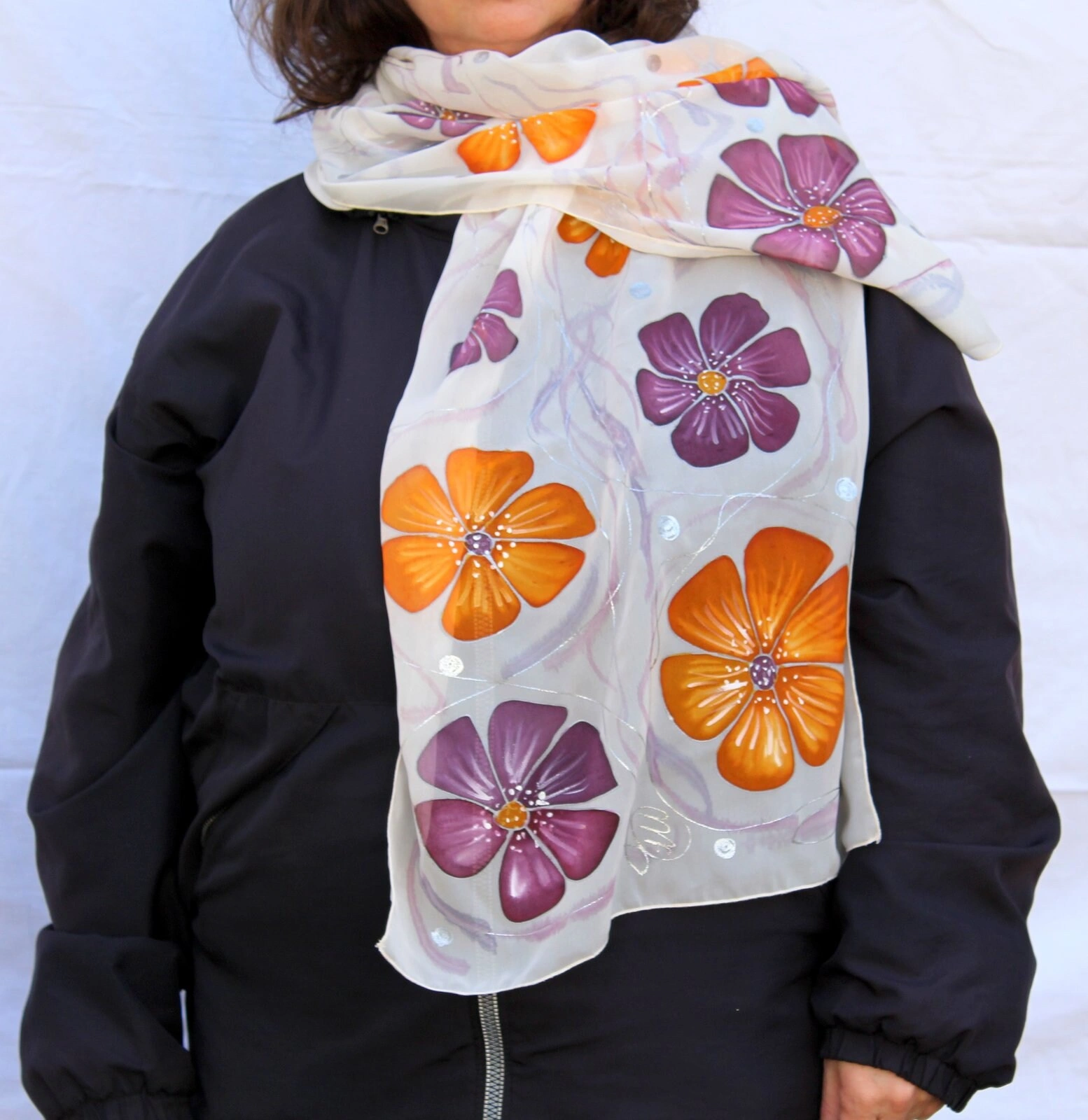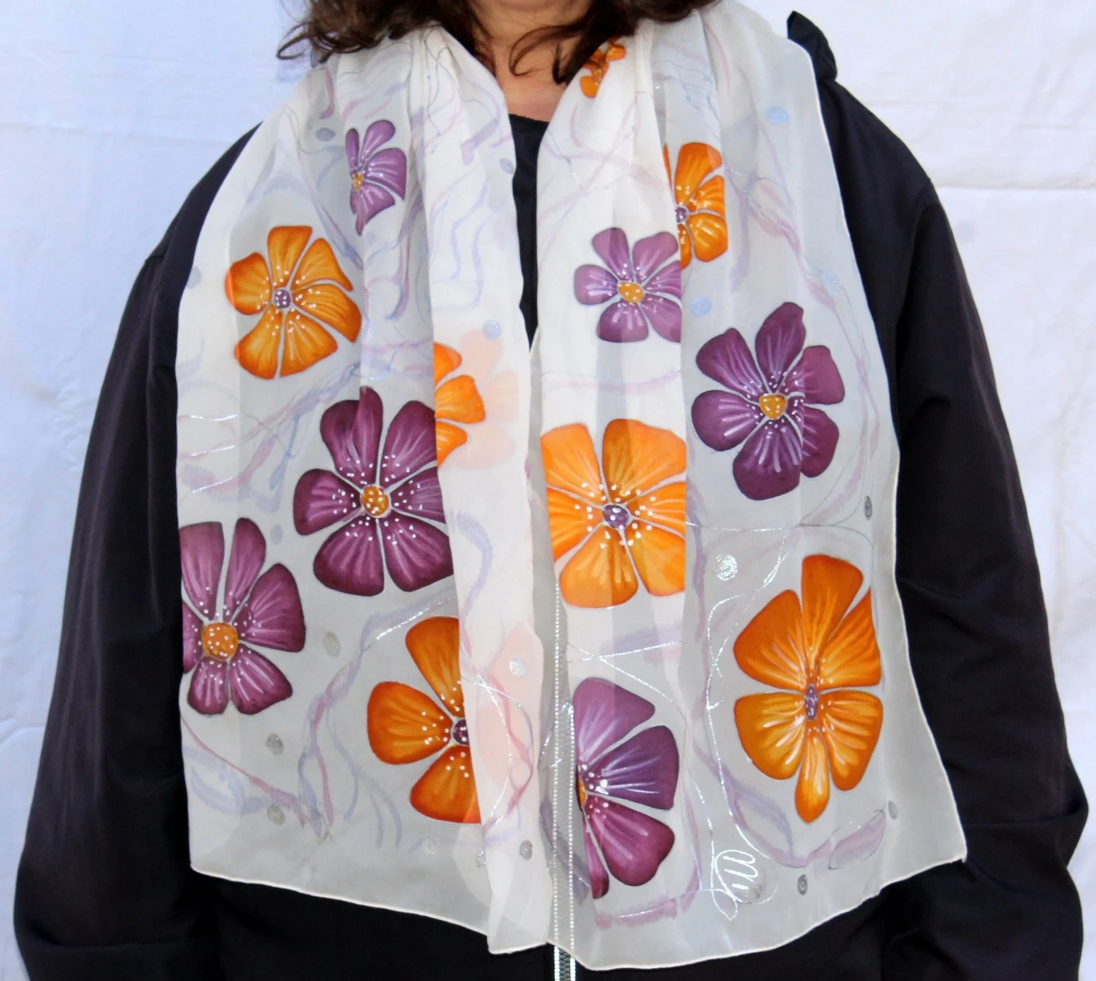 “Лилави и Оранжеви цветя”. Копринен шал с размер 140×40см.