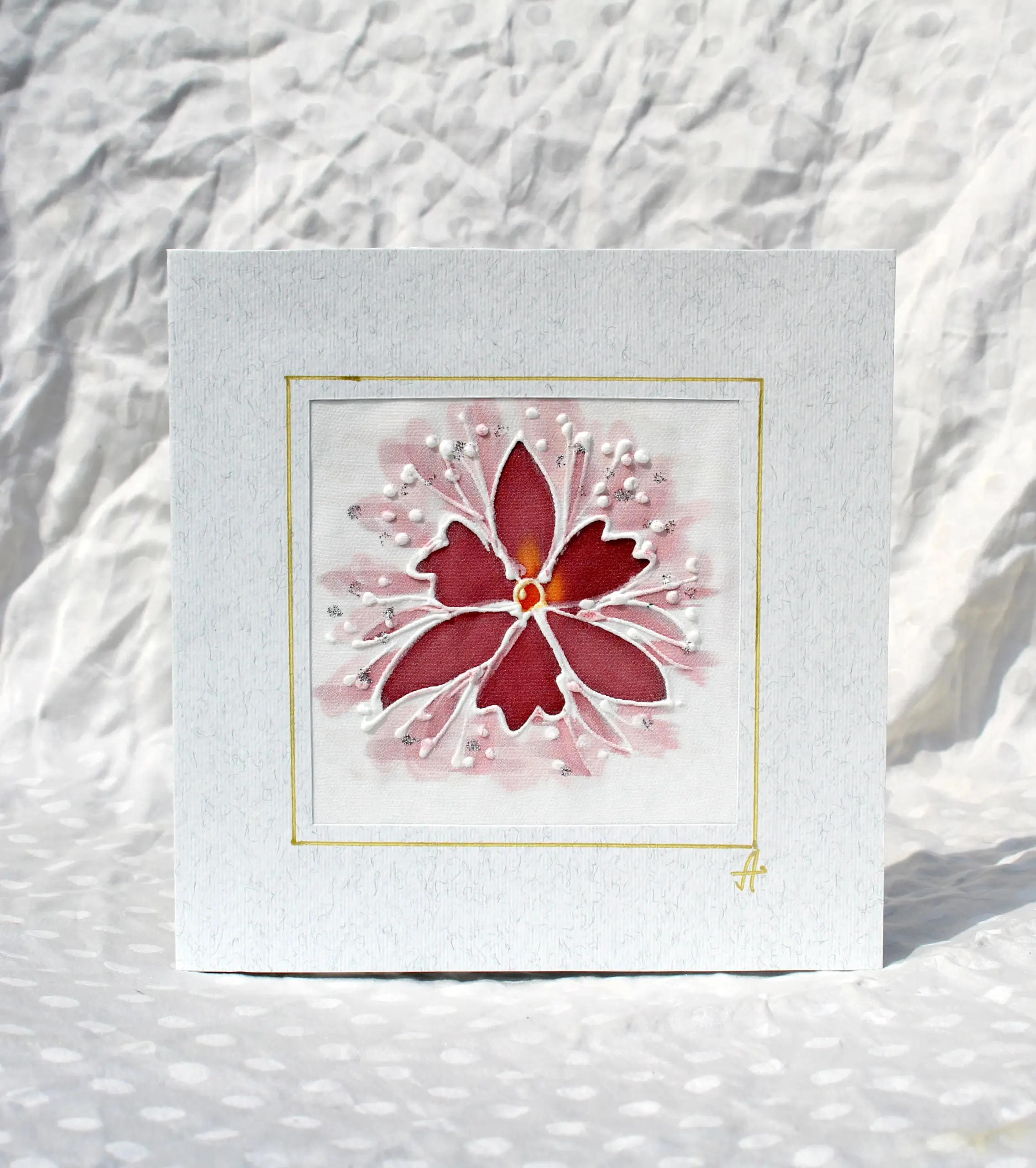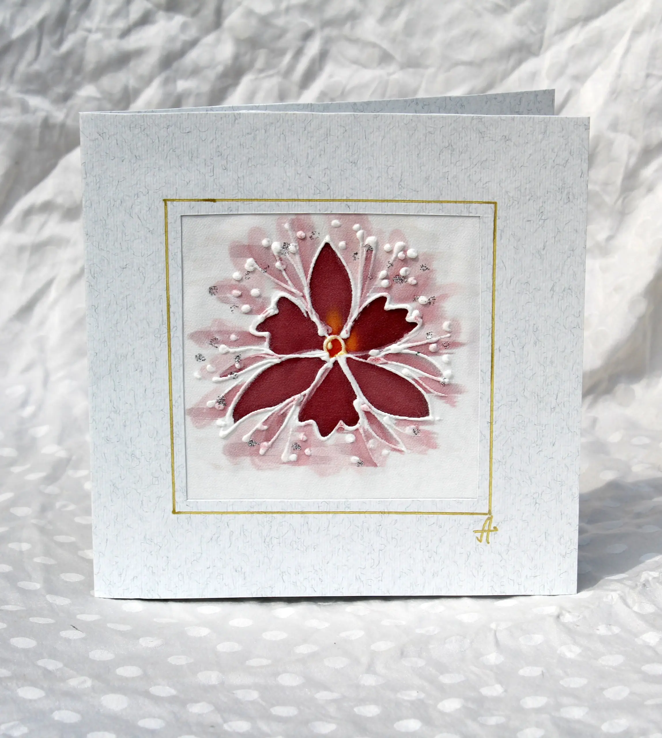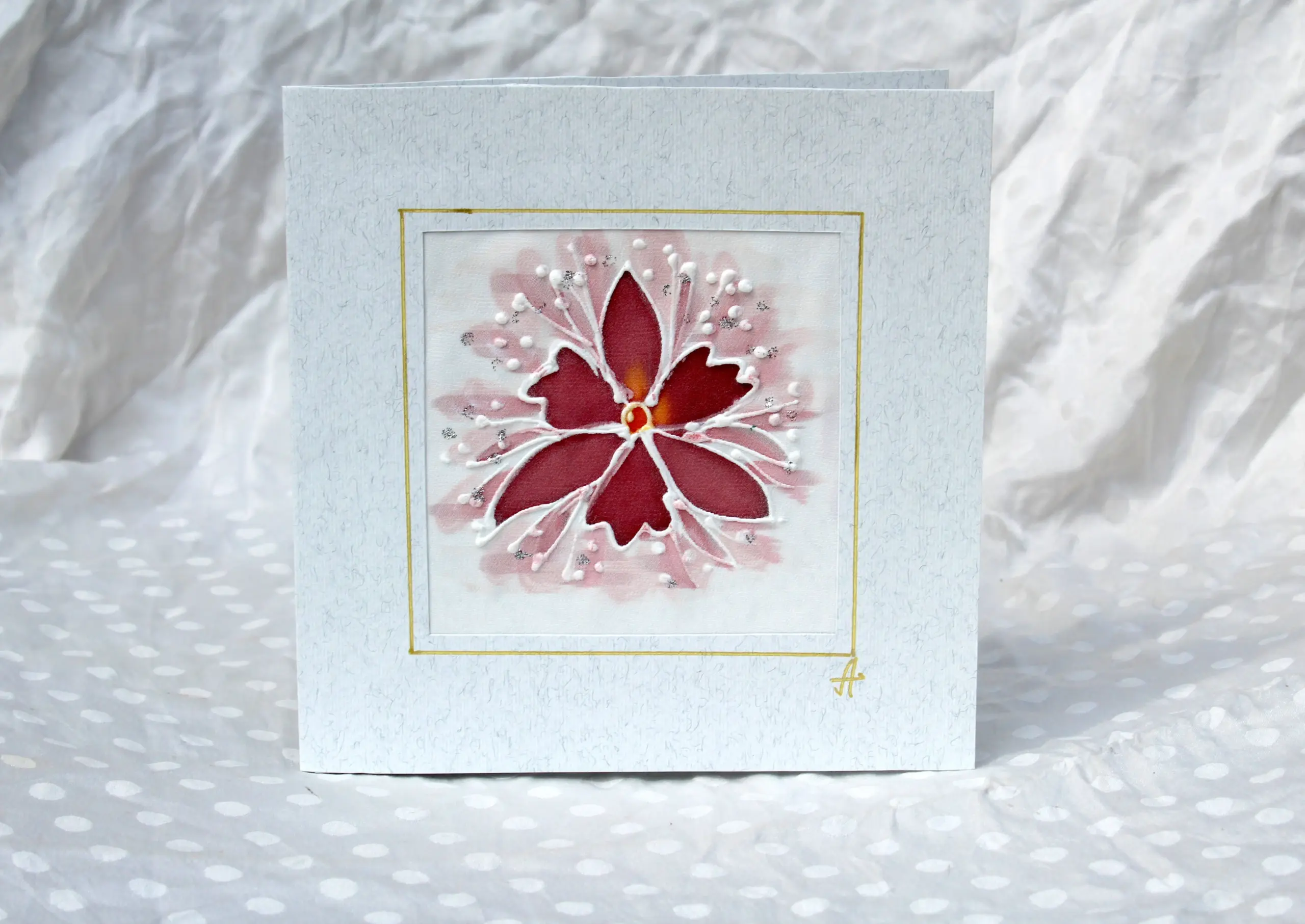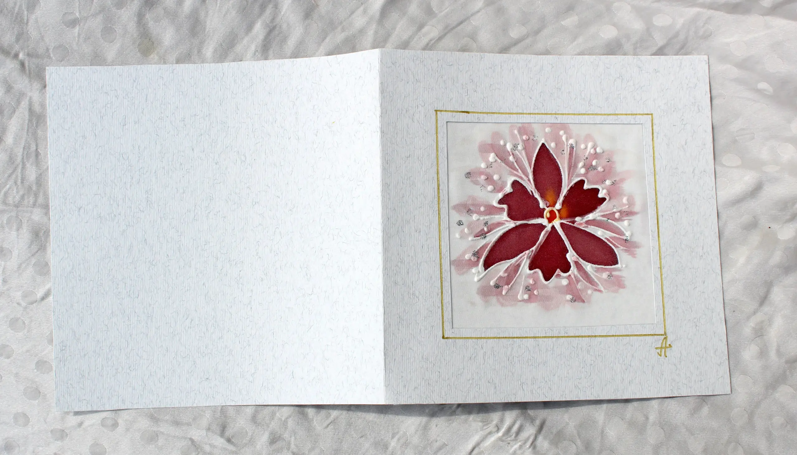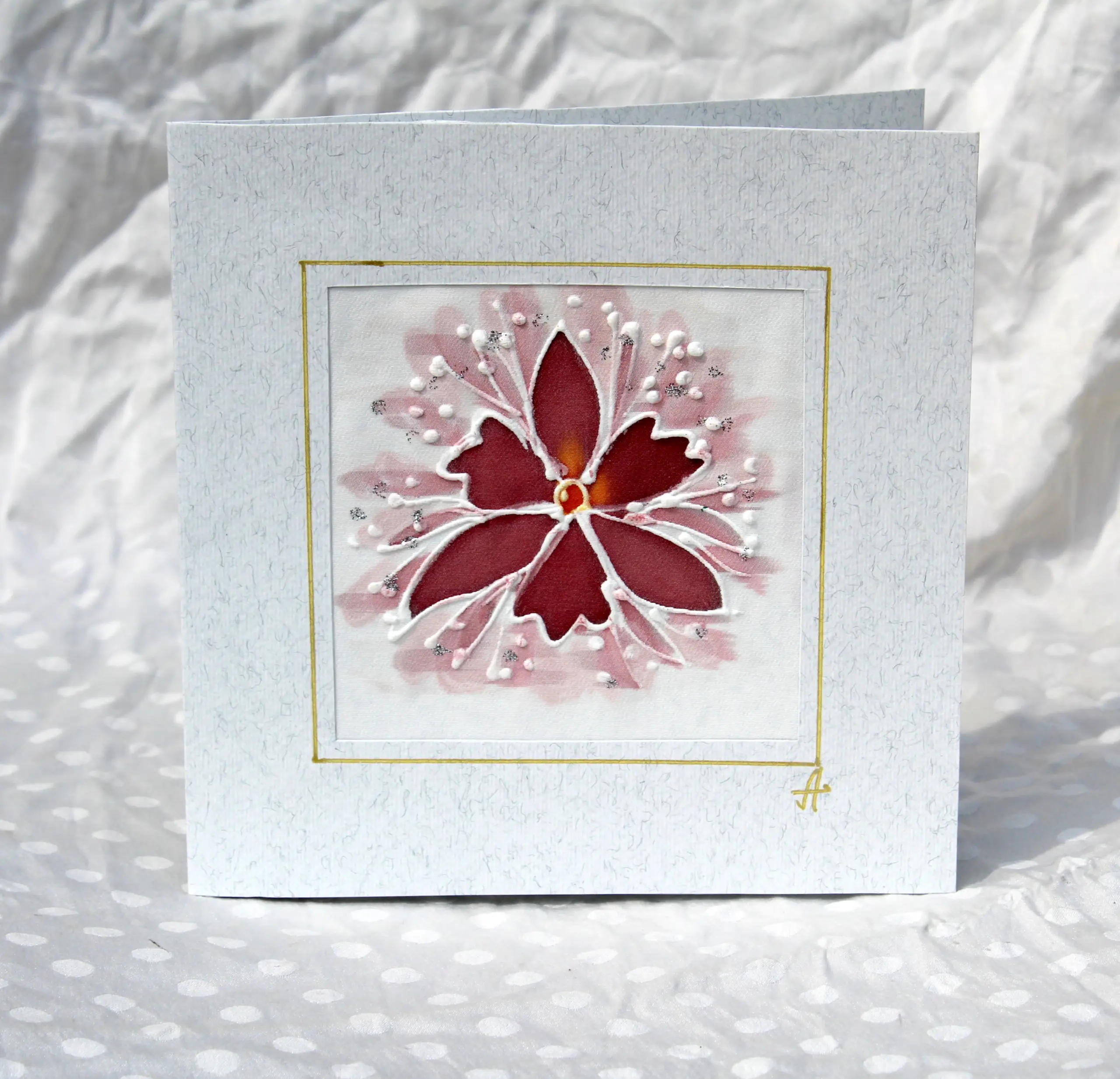 Всяка наша картичка е уникално ръчно рисувано произведение върху естествена коприна.